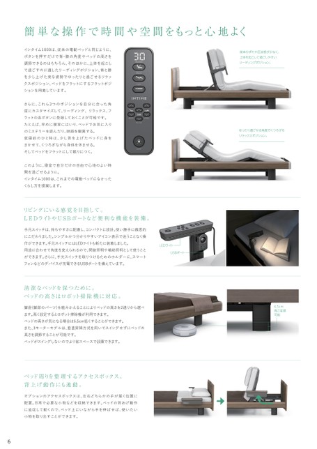 簡単な操作で時間や空間をもっと心地よく身体のずれや圧迫感が少なく、上体を起こして過ごしやすいリーディングポジション。ゆったり過ごせる角度でくつろげるリラックスポジション。6.5cm高さ変更可能インタイム1000は、従来の電動ベッドと同じように、ボタンを押すだけで背・膝の角度やベッドの高さを調節できるのはもちろん、そのほかに、上体を起こして過ごすのに適したリーディングポジション、背と膝を少し上げた楽な姿勢でゆったりと過ごせるリラックスポジション、ベッドをフラットにするフラットポジションを用意しています。さらに、これら3つのポジションを自分に合った角度にカスタマイズして、リーディング、リラックス、フラットの各ボタンに登録しておくことが可能です。たとえば、早めに寝室にはいり、ベッドでお気に入りのミステリーを読んだり、映画を観賞する。就寝前のひと時は、少し背を上げたベッドに身をまかせて、くつろぎながら身体を休ませる。そしてベッドをフラットにして眠りにつく。このように、寝室で自分だけの自由で心地のよい時間を過ごせるように。インタイム1000は、これまでの電動ベッドになかったくらし方を提案します。リビングにいる感覚を目指して。LEDライトやUSBポートなど便利な機能を装備。手元スイッチは、持ちやすさに配慮し、コンパクトに設計。使い勝手に徹底的にこだわりました。シンプルかつ分かりやすいアイコン表示で迷うことなく操作ができます。手元スイッチにはLEDライトも新たに装着しました。用途に合わせて角度を変えられるので、間接照明や補助照明として使うことができます。さらに、手元スイッチを取りつけるためのホルダーに、スマートフォンなどのデバイスが充電できるUSBポートを備えています。LEDライトUSBポート清潔なベッドを保つために。ベッドの高さはロボット掃除機に対応。脚座(脚部のパーツ)を組みかえることによりベッドの高さを2通りから選べます。高く設定するとロボット掃除機が利用できます。ベッドの高さが気になる場合は6.5cm低くすることができます。また、3モーターモデルは、垂直昇降方式を用いてスイングせずにベッドの高さを調節することが可能です。ベッドがスイングしないのでより省スペースで設置できます。ベッド周りを整理するアクセスボックス。背上げ動作にも連動。オプションのアクセスボックスは、左右どちらかの手が届く位置に配置。日常で必要な小物などを収納できます。ベッドの背あげ動作に追従して動くので、ベッド上にいながら手を伸ばせば、使いたい小物を取り出すことができます。6