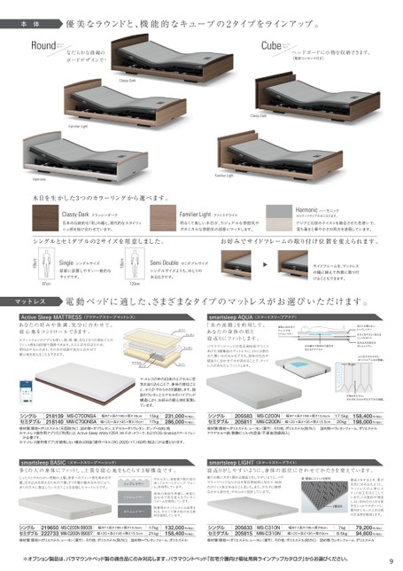 本体優美なラウンドと、機能的なキューブの2タイプをラインアップ。Roundラウンドタイプなだらかな曲線のボードデザインです。ClassyDarkCubeキューブタイプヘッドボードに小物を収納できます。[電源コンセント付き]FamilierLightClassyDarkHarmonicFamilierLight木目を生かした3つのカラーリングから選べます。クラッシーダークClassyDark日本の伝統的な「和」の趣と、現代的なスタイリッシュ感を掛け合わせています。ファミリアライトFamilierLight明るくて美しい木目が、カジュアルな雰囲気やボタニカルな雰囲気の部屋にマッチします。Harmonicハーモニック※ラウンドタイプのみになります。アジアと北欧のテイストを融合させた色使いで、落ち着きと華やかさの両方を表現しています。シングルとセミダブルの2サイズを用意しました。お好みでサイドフレームの取り付け位置を変えられます。サイドフレームを、マットレスけることもできます。セミダブルサイズSemiDoubleシングルサイズよりも、ゆとりのある広さです。195cmシングルサイズSingle部屋に設置しやすい一般的なサイズです。120cm97cm195cmマットレス電動ベッドに適した、さまざまなタイプのマットレスがお選びいただけます。ActiveSleepMATTRESS(アクティブスリープマットレス)あなたの好みや体調、気分に合わせて、寝心地をコントロールできます。スマートフォンのアプリを使い、頭、肩、腰、足など6つの部位ごとのフィット感を10段階で調節できます。たとえば今日はかため、明日はやわらかめと、その日の体調や気分に合わせて寝心地を変えることもできます。smartsleepAQUA(スマートスリープアクア)「水の流動」を利用して、あなたの身体の形と寝返りにフィットします。パラマウンドベッドの等反発技術でつくりあげた3層構造のマットレスに、11に分割された薄い水のセルをプラス。身体の凹凸や寝返りに合わせて水が流れることで、マットレスがあなたにフィットします。マットレスの中の23本のエアセルに空気を送り込むことで、身体の部位ごとに、かたさ・やわらかさを調節します。独自のウレタンとエアセルのハイブリッド構造により、お好みの寝心地を実現しています。218139218140シングルセミダブル●材質:側地=ポリエステル(天面防カビ)、詰め物=ポリウレタン、エアセル=ポリウレタン、ポンプ=ABS他※マットレス操作用アプリのご利用には、ActiveSleepANALYZER、Wi-Fiネットワーク、およびiOS/Androidスマートフォン幅97×長さ195×厚さ16cm幅120×長さ195×厚さ16cm231,000円(税込)286,000円(税込)MS-C700NSAMW-C700NSA15kg17kgが必要です。※マットレス操作用アプリを使用しない場合は別途「操作パネル[RC-2020/17,160円(税込)]が必要となります。smartsleepBASIC(スマートスリープベーシック)多くの人の身体にフィットし、上質な寝心地をもたらす3層構造です。しっとりとやわらかい感触の上層。身体へのフィット感を高める中層。沈み込みを抑えるための下層。3つの層の組み合わせにより、多くの方々に満足していただくことを目指したマットレスです。トップレイヤーやわらかく、高密度で耐久性の高い「スマートスリープフォーム」を採用しています。ミドルレイヤーボトムレイヤー身体の負担を考慮し、体型に合わせて形を変えるウレタンフォームを使用しています。医療用のマットレスにも採用される、かたくて弾力性のある素材を使用しています。シングルセミダブル●材質:側地=ポリエステル、レーヨン(凛竹)、その他、ポリエステル(防カビ)詰め物=ウレタンフォーム、ポリエステル幅97×長さ195×厚さ15.5cm幅120×長さ195×厚さ15.5cmMS-C200NB9008MW-C200NB9007132,000円(税込)158,400円(税込)21965022273317kg21kg205583205811シングルセミダブル●材質:側地=ポリエステル、レーヨン(凛竹)、その他、ポリエステル(防カビ)詰め物=ウレタンフォーム、ポリエステルアクアセル=袋/酢酸ビニル・内溶液/不凍液(防腐剤入)幅97×長さ195×厚さ15.5cm幅120×長さ195×厚さ15.5cm158,400円(税込)198,000円(税込)MS-C200NMW-C200N17.5kg20kgsmartsleepLIGHT(スマートスリープライト)寝返りがしやすいように、身体の部位に合わせてかたさを変えています。眠りの質に大きく関わる寝返りをしやすいように、パラマウントベッドならではの等反発技術に加えて、独自のスリット加工をほどこしました。また、かたさに敏感なかかと部分を、やわらかく設計しています。寝返りをするとき、肩が自然に沈み込むように、マットレスの上部にスリット加工をほどこしています。この独自の「肩逃し」は、仰向けのときは背中をしっかりサポートし、横向きになったときは肩の圧迫感を軽減します。シングルセミダブル●材質:側地=:ポリエステル、レーヨン(凛竹)、その他、ポリエステル(防カビ)詰め物:ウレタンフォーム、ポリエステル幅97×長さ195×厚さ9cm幅120×長さ195×厚さ9cmMS-C310NMW-C310N20563320581579,200円(税込)94,600円(税込)8.5kg7kg※オプション製品は、パラマウントベッド製の適合品にのみ対応します。パラマウントベッド「在宅介護向け福祉用具ラインアップカタログ」からお