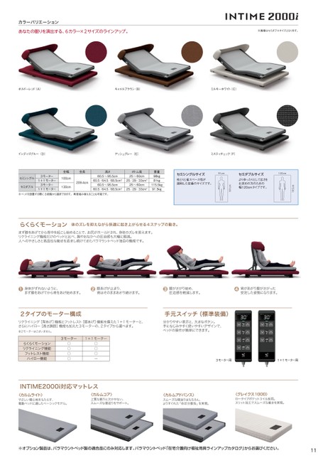 カラーバリエーションあなたの眠りを演出する、6カラー×2サイズのラインアップ。※画像はセミダブルサイズとなります。ボルドーレッド(A)キャメルブラウン(B)ミルキーホワイト(C)インディゴブルー(D)アッシュグレー(E)ミスティチェック(F)195cm120cmセミダブルサイズよりゆったりとして広さをお求めの方のための幅120cmタイプです。191cmセミシングルサイズゆとりと省スペース性が調和した定番のサイズです。91cm重量98kg81kg115.5kg91.5kgセミシングルセミダブル3モーター1+1モーター3モーター1+1モーター全幅100cm130cm全長209.4cm高さ60.5〜95.5cmボトム高25〜60cm60.5/64.5/68.5cm*25/29/33cm*60.5〜95.5cm60.5/64.5/68.5cm*25〜60cm25/29/33cm*※ベッドを設置する際に3段階から選択できます。再度組み替えることも可能です。らくらくモーション体のズレを抑えながら快適に起き上がらせる4ステップの動き。まず膝をあげてから背中を起こし始めることで、お尻がホールドされ、身体のズレを抑えます。リクライニング機能だけのベッドと比べ、胸やおなかへの圧迫感も大幅に軽減。人へのやさしさと高品位な動きを追求し続けてきたパラマウントベッド独自の機能です。❶身体がずれないように、まず膝をあげてから背をあげ始めます。❷膝あげが止まり、背はそのままあがり続けます。❸膝がさがり始め、圧迫感を軽減します。❹背があがり膝がさがった安定した姿勢になります。2タイプのモーター構成リクライニング[背あげ]機能とフットレスト[膝あげ]機能を備えた1+1モーターと、さらにハイロー[高さ調節]機能も加えた3モーターの、2タイプから選べます。※2モーターはございません。手元スイッチ(標準装備)分かりやすい表示と、大きなボタン。手になじみやすく使いやすいデザインで、ベッドの操作が簡単にできます。らくらくモーションリクライニング機能フットレスト機能ハイロー機能3モーター○○○○1+1モーター○○○-3モーター用1+1モーター用INTIME2000i対応マットレス〈カルムライト〉やさしい寝心地をもたらす、電動ベッドに適したベーシックモデル。〈カルムコア〉上質な眠りに欠かせない、スムーズな寝返りをサポート。〈カルムアドバンス〉スムーズな寝返りはもちろん、よりすぐれた「体圧分散性」を実現。〈グレイクス1000〉ロータイプポケットコイル採用。スリット加工でスムーズな動きを実現。※オプション製品は、パラマウントベッド製の適合品にのみ対応します。パラマウントベッド「在宅介護向け福祉用具ラインアップカタログ」からお選びください。11