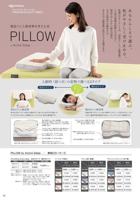 寝返りと入眠姿勢を考えた枕仰向けタイプあなたの寝つきはどっち?横向きタイプ体の左右のバランスが良い姿勢なので、体にかかる圧力が分散しやすくなります。安心した環境だからこそとれる、自然な寝姿勢です。気道が狭くなりにくいため、呼吸がしやすく、いびきをかきにくくなります。腹部や腰の緊張がゆるみ、リラックスしやすい寝姿勢です。頭の位置をずらして高さの微調整を。頭を枕に深く(頭側に)のせれば低く、浅く(足側に)のせれば高く。その日のお好みによって枕の高さを微調整できます。やわらかく心地いい触感の粒わた層。触感はもちろん通気性にも富み、耐久性にも優れています。クッション性にすぐれ、つぶれやへたりに強い立体構造のエアーラッセルを採用。2枚の高さ調整パッドでお好みの高さに。仰向けに対応する「ネックサポート」。仰向けのときは、首から肩をサポートします。やわらかく心地いい触感の粒わた層。触感はもちろん通気性にも富み、耐久性にも優れています。横向きに対応する「ショルダーサポート」。横向きの際に肩をサポートします。2枚の高さ調整パッドでお好みの高さに。仰向け寝つきを支えるネックサポート横向き寝つきを支えるショルダーサポートPILLOWbyActiveSleep/専用ピローケースPILLOWbyActiveSleep仰向けタイプ・横向きタイプパーケル(平織り)フランス綾(綾織)サテンドットチェック(朱子織)商品名型式仰向けタイプRE-ZC060横向きタイプRE-ZC070商品コード219442215083希望小売価格15,950円(税込)〈サイズ〉仰向けタイプ/幅80×長さ43×高さ9.0〜10.0cm横向きタイプ/幅80×長さ36×高さ9.0〜10.0cmエステル100%(粒綿)、中芯:ポリエステル100%(エアーラッセル)、高さ調整パッド:ポリエステル100%〈カラー〉ベージュ〈組成〉仰向けタイプ:枕側地/ポリエステル100%、詰めもの/中袋:ポリエステル100%、中綿:ポリエステル100%(粒綿)、中芯:ポリエステル100%(エアーラッセル)、高さ調整パッド:ポリエステル100%横向きタイプ:枕側地/ポリエステル100%、詰めもの/中綿:ポリ仰向けタイプ80×43cm用横向きタイプ80×36cm用仰向けタイプ80×43cm用横向きタイプ80×36cm用仰向けタイプ80×43cm用横向きタイプ80×36cm用希望小売価格3,850円(税込)3,850円(税込)希望小売価格4,950円(税込)4,950円(税込)希望小売価格4,950円(税込)4,950円(税込)215084215087215090215093215096215099ベージュRE-ZE80LBERE-ZE86BEホワイトRE-ZE50LWHRE-ZE56WHブルーRE-ZE90LBLRE-ZE96BL215085215088215091215094215097215100アイボリーRE-ZE80LIVRE-ZE86IVブルーRE-ZE50LBLRE-ZE56BLピンクRE-ZE90LPIRE-ZE96PI215086215089215092215095215098215101ピンクRE-ZE80LPIRE-ZE86PIベージュRE-ZE50LBERE-ZE56BEサンドベージュRE-ZE90LSBRE-ZE96SB16