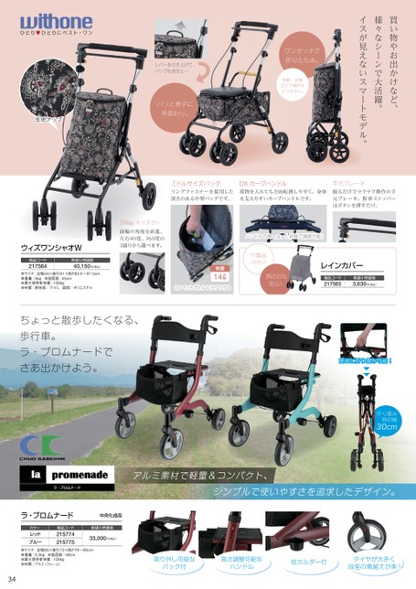 買い物やお出かけなど、様々なシーンで大活躍。イスが見えないスマートモデル。ワンタッチで折りたたみ。移動・玄関などで場所をとりません。レバーを引き上げて、バッグを倒すと…パッと椅子に早変わり。生地アップウィズワンシャオW3Wayキャスター前輪の角度を直進、左右40度、360度の3通りから選べます。希望小売価格商品コード21756440,150円(税込)●サイズ:全幅44×奥行61×高さ83.5〜91.5cm●重量:5kg●座面高:45cm●最大使用者体重:100kg●材質:車体部/アルミ、袋部/ポリエステルちょっと散歩したくなる、歩行車。ラ・プロムナードでさあ出かけよう。ミドルサイズバッグリングファスナーを採用した深さのある中型バッグです。DXカーブハンドル荷物を入れても方向転換しやすく、身体を支えやすいカーブハンドルです。手元ブレーキ握るだけでラクラク操作の手元ブレーキ。駐車ストッパーはボタンを押すだけ。ハンドルの高さは、5段階で調節可能I容量14ℓ2ℓペットボトルもラクラク♪付属品(別売り)レインカバー雨の日も安心!商品コード217565希望小売価格3,630円(税込)簡単に折り畳み可能!折り畳み時の幅30cmアルミ素材で軽量&コンパクト、シンプルで使いやすさを追求したデザイン。取り外し可能なバック付高さ調整可能なハンドル杖ホルダー付タイヤが大きく段差の乗越えが楽!ラ・プロムナードカラーレッドブルー商品コード215774215775中央化成品希望小売価格33,000円(税込)●サイズ:全幅55×奥行72×高さ79〜85cm●重量:5.3kg●座面高:49cm●最大使用者体重:100kg●材質:アルミ(フレーム)34