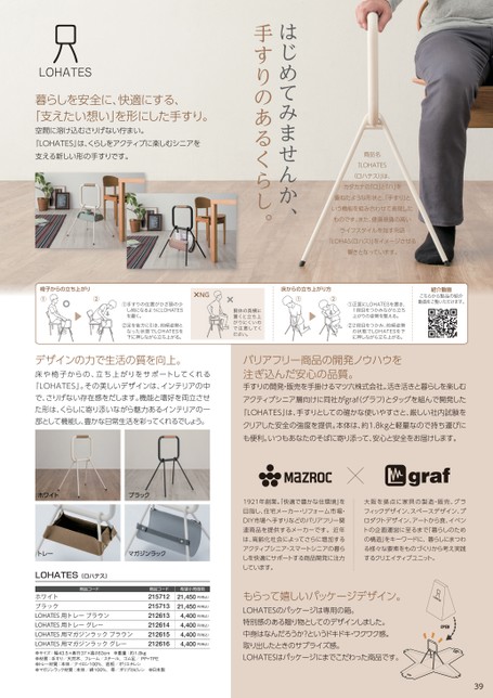 商品名「LOHATES(ロハテス)」は、カタカナの「ロ」と「ハ」を重ねたような形状と、手すり」という機能を組み合わせて表現したものです。また、健康意識の高いライフスタイルを指す用語「LOHAS(ロハス)」をイメージさせる響きとなっています。はじめてみませんか、手すりのあるくらし。暮らしを安全に、快適にする、「支えたい想い」を形にした手すり。空間に溶け込むさりげない佇まい。『LOHAT支える新しい形の手すりです。ES』は、くらしをアクティブに楽しむシニアを紹介動画こちらから製品の紹介動画をご覧いただけます。①正面にLOHATESを置き、1段目をつかみながら立ち上がりの姿勢を整える。②2段目をつかみ、前傾姿勢の状態でLOHATESを下に押しながら立ち上がる。×NG床からの立ち上がり方①②胴体の真横にくと立ち上りにくいの注意してくさい。置がでだ椅子からの立ち上がり①②①手すりの位置がひざ頭の少し前になるようにLOHATESを置く。②足を後方に引き、前傾姿勢となった状態でLOHATESを下に押しながら立ち上がる。デザインの力で生活の質を向上。床や椅子からの、立ち上がりをサポートしてくれる『LOHATES』。その美しいデザインは、インテリアの中で、さりげない存在感をだします。機能と嗜好を両立させた形は、くらしに寄り添いながら魅力あるインテリアの一部として機能し、豊かな日常生活を彩ってくれるでしょう。バリアフリー商品の開発ノウハウを注ぎ込んだ安心の品質。手すりの開発・販売を手掛けるマツ六株式会社。活き活きと暮らしを楽しむアクティブシニア層向けに同社がgraf(グラフ)とタッグを組んで開発した『LOHATES』は、手すりとしての確かな使いやすさと、厳しい社内試験をクリアした安全の強度を提供。本体は、約1.8kgと軽量なので持ち運びにも便利。いつもあなたのそばに寄り添って、安心と安全をお届けします。ホワイトラブックマガジンラックトレーLOHATES(ロハテス)商品コードホワイトブラックLOHATES用トレーブラウンLOHATES用トレーグレーLOHATES用マガジンラックブラウンLOHATES用マガジンラックグレー●サイズ:幅43.5×奥行37×高さ63cm●重量:約1.8kg●材質:手すり/天然木、フレーム/スチール、ゴム足/PP+TPE●トレー材質:本体/ナイロン100%、底板/ポリエチレン●マガジンラック材質:本体/綿100%、帯/ポリプロピレン●日本製商品コード2157122157132126132126142126152126161921年創業。快適で豊かな住環境」を目指し、住宅メーカー・リフォーム市場・DIY市場へ手すりなどのバリアフリー関連商品を提供するメーカーです。近年は、高齢化社会によってさらに増加するアクティブシニア・スマートシニアの暮らしを快適にサポートする商品開発に注力しています。大阪を拠点に家具の製造・販売、グラフィックデザイン、スペースデザイン、プロダクトデザイン、アートから食、イベントの企画運営に至るまで「暮らしのための構造」をキーワードに、暮らしにまつわる様々な要素をものづくりから考え実践するクリエイティブユニット。希望小売価格21,450円(税込)21,450円(税込)4,400円(税込)4,400円(税込)4,400円(税込)4,400円(税込)もらって嬉しいパッケージデザイン。LOHATESのパッケージは専用の箱。特別感のある贈り物としてのデザインしました。中身はなんだろうか?というドキドキ・ワクワク感。取り出したときのサプライズ感。LOHATESはパッケージにまでこだわった商品です。39
