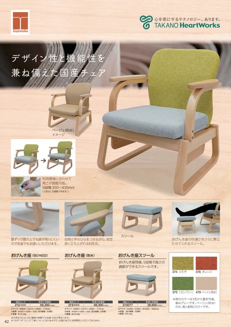 デザイン性と機能性を兼ね備えた国産チェアベージュ(防水)イメージ利用環境に合わせて高さが調整可能。5段階:350〜430mm(工具なできますしで調整。)畳ずりで畳の上でも跡が残りにくいので和室でもお使いいただけます。自然と手のひらをつきながら、安定良く立ち上がれる肘形状。スツルーおげんき座の快適さをさらに際立たせてくれるスツール。おげんき座(BO-N02)おげんき座(防水)希望小売価格30069,円(税込)H695〜775m×m:5段階430(高さ調整)商品コード219***●サイズ:W600450×座面:●W●重量:約10.4㎏、同じ種類の樹種木のため※天然くりで丁※1台ずつ手づ寧につく×D570H350〜でも色調っており異なりま・木目が、ますのでお届け希望小売価格商品コード219***69,30075m〜7●サイズ:H6W600×D570m95×〜430(450×座面●:W高さ調整55:段階重量:約0.41●㎏す。H30おりますただいて時間をいまでにお。(税込)円)42座スツールおげんきおげ調節がでんき座同様、5段階で高さのきるスツールです。374ミモザ376オレンジ375イエローグリーン479ベージュ(防水)※背のカラーは3色から選択可能、座はグレーです。ベージュ(防水)のみ、背と座同じカラーです。商品コード219377W465●サイズ:D350×座面:●(高さ調整:5段階5.4k重量:約●g)SH32×希望小売価格28,600円(税込)405m5〜m