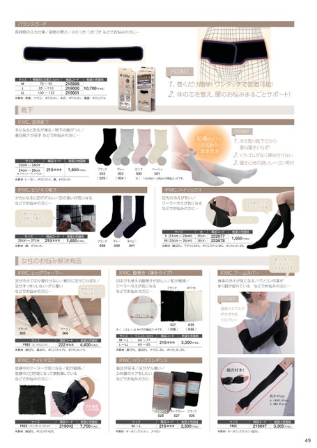 冷え取り靴下だから重ね履きいらず!くちゴムがなく締め付けない履き心地の良いレーヨン素材.3.2POINT1.足湯のようにじんわりポカポカ巻くだけ簡単!ワンタッチで装着可能!体の芯を整え、腰のお悩みまるごとサポート!.2.1POINTバランスガード長時間の立ち仕事/姿勢の悪さ/ふらつき・つまづきなどでお悩みの方に…サイズMLLL骨盤周りの長さ(cm)70〜9585〜110100〜125商品コード218999219000219001希望小売価格10,780円(税込)●素材:表面/ナイロン、ポリウレタン、中芯/ポリウレタン、裏面/ポリエステル靴下IFMC.温泉靴下冬になると足先が凍る/靴下の跡がつく/着圧靴下が苦手などでお悩みの方に…サイズ22cm〜24cm24cm〜26cm※ブラック/グレーのみ商品コード希望小売価格219***1,650円(税込)●素材:レーヨン、ポリエステル、絹、ポリウレタンブラック023(025)グレー022(024)ベージュピンク020※()は24cm〜26cmの商品コードです。021IFMC.ビジネス靴下夕方になると足がダルい/足の臭いが気になるなどでお悩みの方に…通気性・吸収性・保湿性に優れたオールシーズンタイプIFMC.ハイソックス足先の冷えが辛い/クーラー冷えが気になるなどでお悩みの方に…年中使用できるほどよい生地厚やさしくフィットサイズ25cm〜27cm商品コード219***希望小売価格1,650円(税込)●素材:綿、ポリウレタンブラック039グレー040ネイビー041サイズS(21cm〜23cm)M(23cm〜25cm)丈35cm38cm商品コード222677222678希望小売価格1,650円(税込)●素材:綿55%、アクリル24%、ポリエステル19%、ポリウレタン2%女性のお悩み解決商品IFMC.レッグウォーマーIFMC.腹巻き(薄手タイプ)IFMC.アームカバー夏の日焼けが気になる方にもおすすめです!足が冷えて中々寝付けない/朝方に足がこわばる/足がすっきりしない・ダル重いなどでお悩みの方に…表側は綿100%内側は絹100%日中でも使える腹巻きが欲しい/肌が敏感/クーラー冷えが気になるなどでお悩みの方に…ブラックホワイトブラック805ージュベ806サイズFREE(丈約52cm)商品コード222***希望小売価格4,400円(税込)※()はL〜LLサイズの商品コードです。037(038)035(036)サイズM〜LL〜LLウエスト(cm)64〜7769〜85商品コード219***希望小売価格3,300円(税込)●素材:綿52%、絹40%、ポリエステル7%、ポリウレタン1%●素材:綿75%、絹20%、ナイロン3%、ポリウレタン2%IFMC.ナイトマスク就寝中のクーラーが気になる/肌が敏感/就寝中に口呼吸になって朝乾燥しているなどでお悩みの方に…IFMC.リラックスレギンス着圧が苦手/足がダル重い/24h脚のケアをしたいなどでお悩みの方に…身体の冷えが気になる/パソコン作業が多く腕が疲れているなどでお悩みの方に…POINT温泉ミネラルでポカポカ&リカバリー天然繊維シルク使用サイズFREE(大人用丈30cm)商品コード219042希望小売価格7,700円(税込)サイズM〜Lカシミア杢028ダークグレー027ブラック026商品コード219***希望小売価格3,300円(税込)サイズFREE商品コード219047希望小売価格3,300円(税込)●素材:綿98%、ポリエステル2%●素材:オーガニックコットン、ナイロン●素材:オーガニックコットン100%49