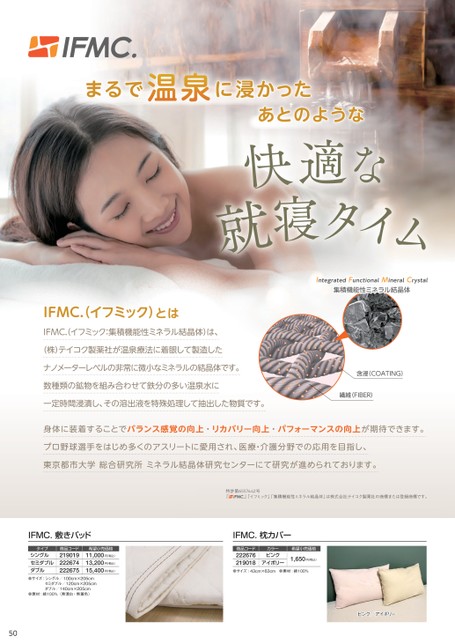 まるでに浸かったあとのような快適な就寝タイムIntegratedFunctionalMineralCrystal集積機能性ミネラル結晶体IFMC.(イフミック)とはIFMC.(イフミック:集積機能性ミネラル結晶体)は、(株)テイコク製薬社が温泉療法に着眼して製造したナノメーターレベルの非常に微小なミネラルの結晶体です。数種類の鉱物を組み合わせて鉄分の多い温泉水に一定時間浸漬し、その溶出液を特殊処理して抽出した物質です。含浸(COATING)繊維(FIBER)身体に装着することでバランス感覚の向上・リカバリー向上・パフォーマンスの向上が期待できます。プロ野球選手をはじめ多くのアスリートに愛用され、医療・介護分野での応用を目指し、東京都市大学総合研究所ミネラル結晶体研究センターにて研究が進められております。特許第6557442号「」「イフミック」「集積機能性ミネラル結晶体」は株式会社テイコク製薬社の商標または登録商標です。IFMC.敷きパッドタイプシングルセミダブルダブル●サイズ:シングル/100cm×205cm商品コード219019222674222675希望小売価格11,000円(税込)13,200円(税込)15,400円(税込)セミダブル/120cm×205cmダブル/140cm×205cm●素材:綿100%(無漂白・無着色)50IFMC.枕カバー商品コード222676219018カラーピンクアイボリー希望小売価格1,650円(税込)●サイズ:43cm×63cm●素材:綿100%ピンク/アイボリー
