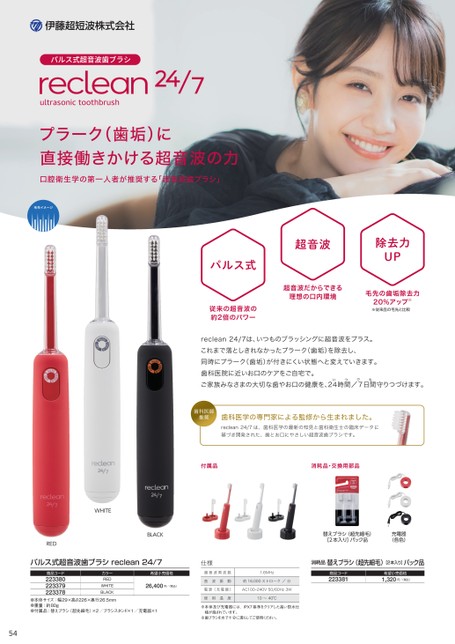 プラーク(歯垢)に直接働きかける超音波の力口腔衛生学の第一人者が推奨する「超音波歯ブラシ」パルス式従来の超音波の約2倍のパワー超音波除去力UP超音波だからできる理想の口内環境毛先の歯垢除去力20%アップ※※従来品の毛先と比較reclean24/7は、いつものブラッシングに超音波をプラス。これまで落としきれなかったプラーク(歯垢)を除去し、同時にプラーク(歯垢)が付きにくい状態へと変えていきます。歯科医院に近いお口のケアをご自宅で。ご家族みなさまの大切な歯やお口の健康を、2いつでも4時間/7日間守りつづけます。歯科医師推奨歯科医学の専門家による監修から生まれました。reclean24/7は、歯科医学の最新の知見と歯科衛生士の臨床データに基づき開発された、歯とお口にやさしい超音波歯ブラシです。付属品消耗品・交換用部品WHITEREDBLACKパルス式超音波歯ブラシreclean24/7仕様商品コード223380223379223378カラーREDWHITEBLACK26,400円/(税込)●本体サイズ:幅29×高さ226×奥行26.5mm●重量:約80g●付属品:替えブラシ(超先細毛)×2/ブラシスタンド×1/充電器×154希望小売価格超音波周波数1.6MHz音波振動約16,000ストローク/分電源(充電器)AC100‒240V50/60Hz3W使用温度10〜40℃※本体及び充電器には、IPX7基準をクリアした高い防水仕様が施されています。※歯ブラシを水で十分に濡らしてご使用ください。替えブラシ(超先細毛)[2本入り]パック品充電器(各色)消耗品替えブラシ(超先細毛)[2本入り]パック品商品コード223381希望小売価格1,320円/(税込)