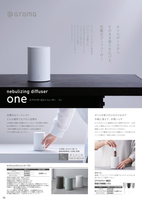 オイルボトルからそのまま香りを広げる、充電式ディフューザーエッセンシャルオイル本来のフレッシュな香りを火や熱を使わず空気の圧力でオイルをミスト状にして空間へ広げる「ネブライザー式」の噴霧で、エッセンシャルオイルそのものの香りを感じることができます。nebulizingdiffuseroneネブライザー式ディフューザーワン充電式&コードレスでどんな場所でもアロマ空間を大容量の充電池が搭載されているので、約5時間の充電で約40時間(中モードの場合)稼働させることができます。ご自宅や職場・お出かけの時など、お好きな場所でアロマ空間をお楽しみください。お部屋に合わせて選べる濃度調整機能(3段階)搭載運転モード弱中強お部屋の広さ(目安)約6畳約12畳約20畳希望小売価格9,900円(税込)ネブライジングディフューザーワンカラー○ホワイト●グレイッシュブラウン●アッシュブルー商品コード219147224061224062●本体寸法:直径75mm●高さ113mm●外装寸法:幅125×高さ115×奥行85mm●重量:約280g●電源:DC5V(USBケーブル)●消費電流:200mA※動作中の最大値となります。●充電電池:チウムイオン充電池3.7V2200mAh●噴霧方式:ネブライザー●充電時間:約5時間●連続運転時間時間:満充電約40時間(中モードの場合)●運転モード:弱(5秒噴霧/55秒停止)、中(10秒噴霧/50秒停止)、強(15秒噴霧/45秒停止)●オートオフ機能:あり(約2時間で自動停止)●消費量目安:中0.2ml●最大拡散能力:約20畳※使用環境やオイルの種類により異なります。●付属品:充電用USBケーブル(長さ約1m)、ドロッパーオープナー56ボトルを取り付けるだけなので手軽に使えて、手間いらずオイルをボトルごと直接取り付けて使用できるので、こまめに注いで補充したりといった手間がかかりません。ボトルを装着したまま、使うときだけスイッチをONに。ボタン1つで電源のON/OFFや運転モードを切替できるシンプル操作で、手軽にお使いいただけます。使用方法噴霧ノズルにアットアロマ社製アロマオイル(10ml)を取り付けてご使用ください。【アクセサリー備品】取替え用噴霧ノズルカラー○ホワイト商品コード219148●グレイッシュブラウン224063224064●アッシュブルー希望小売価格1,540円(税込)