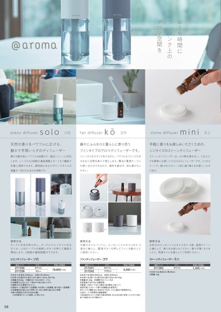 おうち時間にワンランク上のアロマ空間をpiezodiffusersoloソロfandiffuserkoコウstonediffuserminiミニ天然の香りをパワフルに広げる、静かにふんわりと暮らしに寄り添う手軽に香りをお楽しみいただくための、静かで手間いらずのディフューザーファンタイプのアロマディフューザーです。ミニサイズのストーンディフューザー静かな動作音とパワフルな拡散力で、幅広いシーンに対応コンパクトなボディでありながら、パワフルなファンでさまストーンディフューザーは、火や熱を使わない、どなたにします。シンプルな3段階の濃度調整とオートオフ機能でざまな小空間を香りで満たします。電池と電源ケーブルでも簡単にお使いいただけるディフューザーです。2つのス手軽に使用できます。透明感のあるデザインでオイルのの使い分けができるので、場所を選ばず、持ち運びもしトーンで、朝・夕などのシーン別に違う香りをお使いいただ残量が一目でわかるのも特徴です。やすい。けます。使用方法タンクと本体を取り外し、タンクにピエゾオイルを注ぎ入れ、USBケーブルを接続しボタンを押して運転を開始します。3段階の濃度調整ができます。使用方法内蔵のオイルパッドに、エッセンシャルオイルを3〜5滴ほど垂らし、電源ボタンを押してファンを動かしてご使用ください。使用方法お好みのエッセンシャルオイルを2〜3滴、直接ストーンに垂らして、香りをお楽しみください。香りが薄くなりましたら、再度オイルを垂らしてご利用ください。ピエゾディフューザーソロ商品コード217235217236カラーホワイトグレー希望小売価格19,800円(税込)●本体寸法:直径約65mm●高さ約190mm●外装寸法:幅233×奥行120×高さ115mm約475g●重量:約320g●電源:DC5V(USBケーブル)●消費電力:0.5A以下※動作中の最大値となります。●噴霧方式:圧電素子(エゾ)●運転モード:弱60秒に1回噴霧、中20秒に1回噴霧、強10秒に1回噴霧●消費量目安:弱0.3ml/時間、中1.0ml/時間、強2.0ml/時間●最大拡散能力:約70㎡(約40畳)※使用環境やオイルの種類により異なります。ファンディフューザーコウ商品コード217241217242カラーホワイトブラウン希望小売価格3,300円(税込)●本体寸法:直径約65mm●高さ約65mm●外装寸法:幅115×奥行80×高さ70mm約150g●重量:約94g●噴霧方式:ファン方式●拡散能力:約10㎡(5畳程度)●電源:USBコードまたは電池(単4電池2本)にて使用可能(エネループ等の充電電池も使用可)●オートオフ機能:あり(約20分でOFF。ただし電池で使用時のみ。USBケーブル使用時は連続運転)※新品電池またはフル充電の充電池使用時、20分x約30回ご使用いただけます(目安)香りの強弱:ON/OFF機能のみストーンディフューザーミニ商品コード217263カラーホワイト●本体寸法:直径43×厚さ8mm●重量:16g希望小売価格1,045円(税込)58