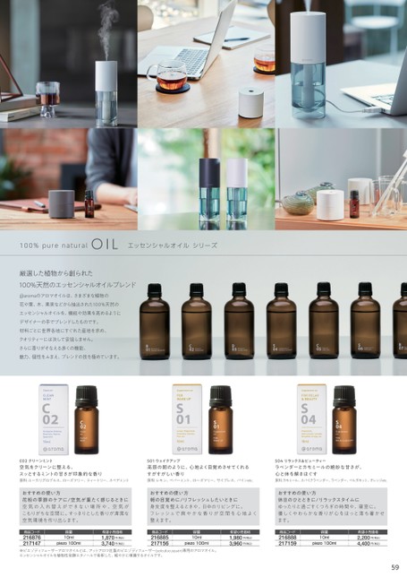 100%purenaturalOILエッセンシャルオイルシリーズ厳選した植物から創られた100%天然のエッセンシャルオイルブレンド@aromaのアロマオイルは、さまざまな植物の花や葉、木、果実などから抽出された100%天然のエッセンシャルオイルを、機能や効果を高めるようにデザイナーの手でブレンドしたものです。材料ごとに世界各地にすぐれた産地を求め、クオリティーには決して妥協しません。さらに香りがそなえる多くの機能、魅力、個性をふまえ、ブレンドの技を極めています。C02クリーンミント空気をクリーンに整える、スッとするミントの甘さが印象的な香り原料:ユーカリグロブルス、ローズマリー、ティートリー、スペアミントS01ウェイクアップ高原の朝のように、心地よく目覚めさせてくれるすがすがしい香り原料:レモン、ペパーミント、ローズマリー、サイプレス、パインetc.S04リラックス&ビューティーラベンダーとカモミールの絶妙な甘さが、心と体を解きほぐす原料:カモミール、スパイクラベンダー、ラベンダー、ベルガモット、オレンジetc.おすすめの使い方花粉の季節のケアに/空気が重たく感じるときに空気の入れ替えができない場所や、空気がこもりがちな空間に。すっきりとした香りが清潔な空気環境を作り出します。おすすめの使い方朝の目覚めに/リフレッシュしたいときに身支度を整えるときや、日中のリビングに。フレッシュで爽やかな香りが空間を心地よく整えます。おすすめの使い方休日のひとときに/リラックスタイムにゆったりと過ごすくつろぎの時間や、寝室に。優しくやわらかな香りが心をほっと落ち着かせます。商品コード216876217147容量10mlpiezo100ml希望小売価格1,870円(税込)3,740円(税込)商品コード216885217156容量10mlpiezo100ml希望小売価格1,980円(税込)3,960円(税込)商品コード216888217159容量10mlpiezo100ml希望小売価格2,200円(税込)4,400円(税込)※ピエゾディフューザーアロマオイルとは、アットアロマ社製のピエゾディフューザー(solo,duo,squair)専用のアロマオイル。エッセンシャルオイルを植物性発酵エタノールで希釈した、軽やかに噴霧するオイルです。59