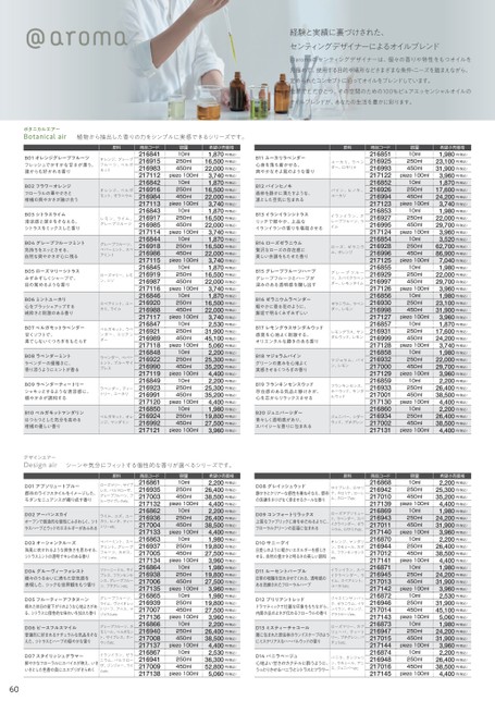 経験と実績に裏づけされた、センティングデザイナーによるオイルブレンド@aromaのセンティングデザイナーは、個々の香りや特性をもつオイルを見極めて、使用する目的や場所などさまざまな条件・ニーズを踏まえながら、定められたコンセプトに沿ってオイルをブレンドしています。世界でただひとつ、その空間のための100%ピュアエッセンシャルオイルのオイルブレンドが、あなたの生活を豊かに彩ります。ボタニカルエアーBotanicalair植物から抽出した香りの力をシンプルに実感できるシリーズです。原料B01オレンジグレープフルーツフレッシュでかすかな甘さが漂う、誰からも好かれる香りオレンジ、グレープフルーツ、ベルガモットB02フラワーオレンジフローラルの華やかさと柑橘の爽やかさが融け合うB03シトラスライム清涼感と潔さをそなえる、シトラスをミックスした香りオレンジ、ベルガモット、ゼラニウムレモン、ライム、グレープフルーツB04グレープフルーツミント気持ちをスッとさせる、自然な爽やかさが心に残るグレープフルーツ、ペパーミント、スペアミントB05ローズマリーシトラスみずみずしくシャープで、目の覚めるような香りB06ミントユーカリ心をブラッシュアップする純粋さと刺激のある香りローズマリー、レモン、シソスペアミント、ユーカリ、ライムB07ベルガモットラベンダー甘くソフトで、果てしないくつろぎをもたらすベルガモット、ラベンダー、コリアンダーB08ラベンダーミントラベンダーの優雅さに、寄り添うようにミントが香るラベンダー、ペパーミント、ブルーサイプレスB09ラベンダーティートリーシャキッとするような清涼感に、穏やかさが調和するラベンダー、ティートリー、ユーカリB10ベルガモットマンダリンはつらつとした気分を高める柑橘の優しい香りベルガモット、オレンジ、マンダリン商品コード216841216915216983217112216842216916216984217113216843216917216985217114216844216918216986217115216845216919216987217116216846216920216988217117216847216921216989217118216848216922216990217119216849216923216991217120216850216924216992217121容量10ml250ml450mlpiezo100ml10ml250ml450mlpiezo100ml10ml250ml450mlpiezo100ml10ml250ml450mlpiezo100ml10ml250ml450mlpiezo100ml10ml250ml450mlpiezo100ml10ml250ml450mlpiezo100ml10ml250ml450mlpiezo100ml10ml250ml450mlpiezo100ml10ml250ml450mlpiezo100ml希望小売価格1,870円(税込)16,500円(税込)22,000円(税込)3,740円(税込)1,870円(税込)16,500円(税込)22,000円(税込)3,740円(税込)1,870円(税込)16,500円(税込)22,000円(税込)3,740円(税込)1,870円(税込)16,500円(税込)22,000円(税込)3,740円(税込)1,870円(税込)16,500円(税込)22,000円(税込)3,740円(税込)1,870円(税込)16,500円(税込)22,000円(税込)3,740円(税込)2,530円(税込)31,900円(税込)45,100円(税込)5,060円(税込)2,200円(税込)25,300円(税込)35,200円(税込)4,400円(税込)2,200円(税込)25,300円(税込)35,200円(税込)4,400円(税込)1,980円(税込)19,800円(税込)27,500円(税込)3,960円(税込)デザインエアーDesignairシーンや気分にフィットする個性的な香りが選べるシリーズです。原料D01アブソリュートブルー都市のライフスタイルをイメージした、モダンなニュアンスが織り成す香りローズマリー、サイプレス、パルマローザ、グレープフルーツ、ブルーサイプレスetc.D02アーバンスカイオープンで創造的な個性にふさわしく、シトラスハーブとウッドのエネルギーがあふれるライム、ユズ、ユーカリ、ヒノキ、ティートリーetc.D03オーシャンクルーズ海風に吹かれるような爽快さを思わせる、シトラスミントの透明でキレのある香りペパーミント、スペアミント、グレープフルーツ、カボス、パインetc.D04グルーヴィーフォレスト樹々のうるおいに満ちた空気感を表現した、シックな世界観をもつ香りファーニードル、サイプレス、フランキンセンス、グレープフルーツ、プチグレンetc.D05フルーティーアフタヌーン晴れた休日の昼下がりのような心地よさがある、シトラスに個性的な味わいを加えた香りグレープフルーツ、ライム、ヴァイオレットリーフ、アニス、マジョラムetc.D06ピースフルスマイル普遍的に好まれるナチュラルな気品をそなえた、シトラスとハーブの穏やかな香りグレープフルーツ、カモミール、ベルガモット、サイプレス、ホーウッドetc.D07スタイリッシュグラマー鮮やかなフローラルにスパイスが映え、いきいきとした色香の奥にエスプリがきらめくイランイラン、ゼラニウム、パルマローザ、ジンジャー、ライムetc.商品コード216861216935217003217132216862216936217004217133216863216937217005217134216864216938217006217135216865216939217007217136216866216940217008217137216867216941217009217138容量10ml250ml450mlpiezo100ml10ml250ml450mlpiezo100ml10ml250ml450mlpiezo100ml10ml250ml450mlpiezo100ml10ml250ml450mlpiezo100ml10ml250ml450mlpiezo100ml10ml250ml450mlpiezo100ml希望小売価格2,200円(税込)26,400円(税込)38,500円(税込)4,400円(税込)2,200円(税込)26,400円(税込)38,500円(税込)4,400円(税込)1,980円(税込)19,800円(税込)27,500円(税込)3,960円(税込)1,980円(税込)19,800円(税込)27,500円(税込)3,960円(税込)1,980円(税込)19,800円(税込)27,500円(税込)3,960円(税込)2,200円(税込)26,400円(税込)38,500円(税込)4,400円(税