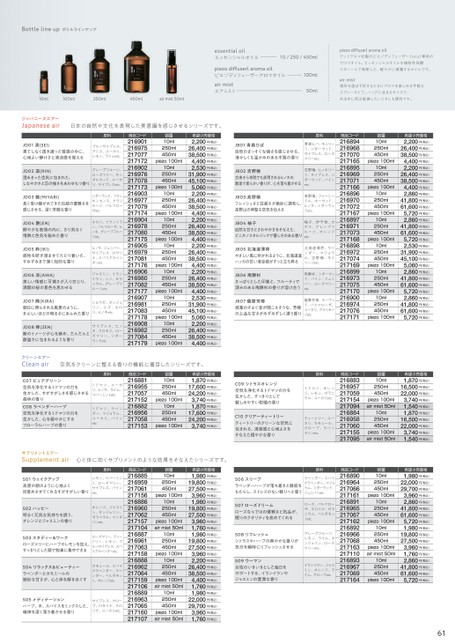 61原料217084216908217178217083216981216907217082216980216906217176217081216905217175217080216978217174217079216977216903217173216976216902217172217077216975商品コード216901217078216904216979217177216982217179250ml容量10ml450ml38,50026,4005,06045,10031,9002,53038,50026,4004,40038,50026,4004,40038,50026,4004,40038,50026,4005,06031,9004,40038,50026,400希望小売価格2,2002,53045,1002,2002,2002,2002,2004,4002,2004,400果てしなく透き通った質感の中に、JD01清(SEI)心地よい静けさと清涼感を覚えるアニス、ユーカリ、ブルーサイプレス、レモン、ライムetc.円(税込)円(税込)円(税込)piezo100ml円(税込)しなやかさと芯の強さをあわせもつ香りJD02凛(RIN)澄みきった空気に包まれた、リ、サイプレスetc.ローズマリー、サングレープフルーツ、ダルウッド、ユーカ250ml10ml450ml円(税込)円(税込)円(税込)piezo100ml円(税込)長く受け継がれてきた伝統の優雅さをJD03雅(MIYABI)感じさせる、深く芳醇な香りセージ、パルマローキンセンス、クラリシダーウッド、フランザetc.250ml10ml450ml円(税込)円(税込)円(税込)piezo100ml円(税込)鮮やかな表情の内に、さり気なくJD04艶(EN)情熱と色気を秘めた香りノキ、グレープフルーン、パルマローザ、ヒネロリ、イランイラツetc.250ml10ml450ml円(税込)円(税込)円(税込)piezo100ml円(税込)すみずみまで潔く知的な香りJD05粋(IKI)感性を研ぎ澄ませてたどり着いた、ダーetc.サイプレス、ロサリヒノキ、ジュニパー、ナ、スパイクラベン250ml10ml450ml円(税込)円(税込)円(税込)piezo100ml円(税込)美しい情感に可憐さが入り交じり、JD06淡(AWA)満開の桜の景色を思わせるニウム、グレープフイラン、シソ、ゼラジャスミン、イランルーツetc.250ml10ml450ml円(税込)円(税込)円(税込)piezo100ml円(税込)朝日に照らされる風景のように、JD07輝(KIRA)まぶしいほどの明るさにあふれた香りリン、ユズ、ネロショウガ、タンジェリ、ヒノキetc.250ml10ml450ml円(税込)円(税込)円(税込)piezo100ml円(税込)静謐さに包まれるような香りJD08禅(ZEN)無のイメージが心を鎮め、だんだんとズマリー、シダーサイプレス、ヒノキ、クロモジ、ローウッドetc.450ml10ml250ml円(税込)円(税込)円(税込)piezo100ml円(税込)原料217076216974216900217075216973216899217169217074216898217168217073216971217167217072216970216896217166216969216895217165217070216968商品コード216894217071216897216972217170217171250ml容量10ml450ml61,60041,8002,86061,60041,8002,8605,06045,1002,5305,72061,60041,8005,72061,60041,8002,8604,40026,4002,2004,40038,50026,400希望小売価格2,20038,5002,86031,9005,7205,720自然のまっすぐな強さを感じさせる、JB01青森ひば清々しくも温かみのある木質の香りサイプレス、ローズフ、シダーウッド、青森ヒバ、モミリーマリーetc.円(税込)円(税込)円(税込)piezo100ml円(税込)無垢で柔らかい香りが、心を落ち着かせるJB02吉野檜古来から寺院でも多用されるヒノキのetc.フ、サイプレス、シ吉野檜、ヒノキリーダーウッド、パイン250ml10ml450ml円(税込)円(税込)円(税込)piezo100ml円(税込)フレッシュさと荘厳さが絶妙に調和し、JB03高野槇高野山の神聖な空気を伝えるヒノキ、シダーウッドル、ホーウッド、高野槇、ファーニードetc.250ml10ml450ml円(税込)円(税込)円(税込)piezo100ml円(税込)自然な甘さとさわやかさをそなえた、JB04柚子どこかノスタルジックで優しさのある香りルーツ、オレンジボス、グレープフ柚子、伊予柑、カetc.250ml10ml450ml円(税込)円(税込)円(税込)piezo100ml円(税込)ハッカの甘い清涼感がすっと立ち昇るJB05北海道薄荷やさしい風に吹かれるように、北海道産リーフetc.ンダー、マジョラ北海道薄荷、ラベム、吉野檜、モミ250ml10ml450ml円(税込)円(税込)円(税込)piezo100ml円(税込)さっぱりとした印象と、フルーティでJB06飛騨杉深みのある飛騨杉の香りが溶け合うパー、ローズマリード、パイン、ジュニ飛騨杉、シダーウッetc.250ml10ml450ml円(税込)円(税込)円(税込)piezo100ml円(税込)枝葉のそよぐ音が聞こえそうな、芳樟JB07薩摩芳樟の上品な甘さがみずみずしく漂う香りユーカリ、クラリセード、パルマローザ、薩摩芳樟、ホーウッジetc.250ml10ml450ml円(税込)円(税込)円(税込)piezo100ml円(税込)日本の自然や文化を表現した美意識を感じさせるシリーズです。ジャパニーズエアーJapaneseair原料217058216956217152217057216955216881商品コード216882217153250ml10ml容量450ml24,20017,6003,74024,20017,600希望小売価格1,8701,8703,740生かした、心を穏やかにする空気を浄化するトドマツの力を森林の香り生かした、すがすがしさを感じさせる空気を浄化するトドマツの力をC07ピュアグリーンC08ラベンダーハーブフローラルハーブの香りリ、ヒノキ、ライム、トドマツ、ユーカペパーミントetc.円(税込)円(税込)円(税込)piezo100ml円(税込)ユーカリ、パインダー、マジョラム、トドマツ、ラベンetc.250ml10ml450ml円(税込)円(税込)円(税込)piezo100ml円(税込)原料217155217060216958216884217154217059216957216883商品コード217094217095250ml10ml容量450ml3,74022,00016,5001,8703,74022,00016,5001,870希望小売価格1,5401,540生かした、すっきりとして空気を浄化するトドマツの力をC09シトラスオレンジ親しみやすい柑橘の香りジ、レモン、ゼラニトドマツ、オレンウム、ユーカリetc.円(税込)円(税込)円(税込)piezo100