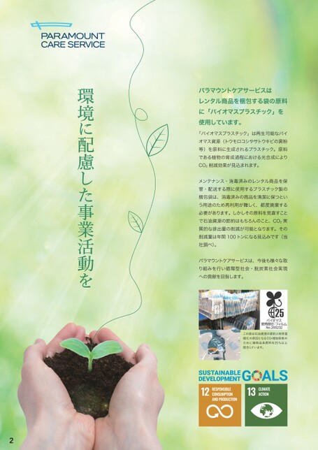 パラマウントケアサービスはレンタル商品を梱包する袋の原料に「バイオマスプラスチック」を使用しています。「バイオマスプラスチック」は再生可能なバイオマス資源(トウモロコシやサトウキビの澱粉等)を原料に生成されるプラスチック。原料である植物の育成過程における光合成によりCO2削減効果が見込まれます。メンテナンス・消毒済みのレンタル商品を保管・配送する際に使用するプラスチック製の梱包袋は、消毒済みの商品を清潔に保つという用途のため再利用が難しく、都度廃棄する必要があります。しかしその原料を見直すことで石油資源の節約はもちろんのこと、CO2実質的な排出量の削減が可能となります。その削減量は年間100トンになる見込みです(当社調べ)。パラマウントケアサービスは、今後も様々な取り組みを行い循環型社会・脱炭素社会実現への貢献を目指します。この袋は石油資源の節約と地球温暖化の原因となるCO2増加抑制のために植物由来原料を25%以上配合しています。環境に配慮した事業活動を2