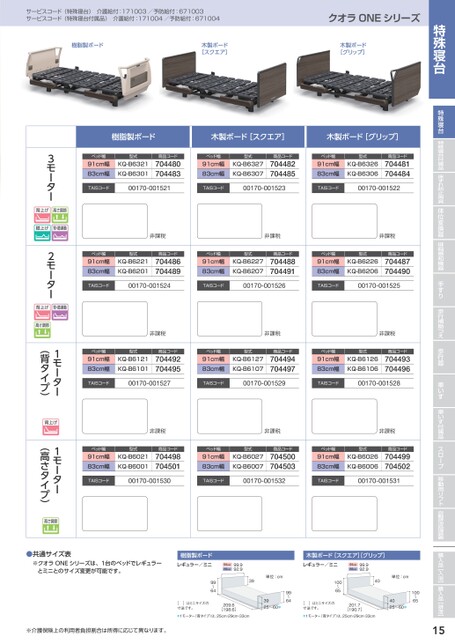 ※介護保険上の利用者負担割合は所得に応じて異なります。サービスコード(特殊寝台)介護給付:171003/予防給付:671003サービスコード(特殊寝台付属品)介護給付:171004/予防給付:671004クオラONEシリーズ樹脂製ボード木製ボード[スクエア]木製ボード[グリップ]樹脂製ボード木製ボード[スクエア]木製ボード[グリップ]ベッド幅91cm幅83cm幅TAISコード型式KQ-B6321KQ-B6301商品コード70448070448300170-001521ベッド幅91cm幅83cm幅TAISコード型式KQ-B6327KQ-B6307商品コード70448270448500170-001523ベッド幅91cm幅83cm幅TAISコード型式KQ-B6326KQ-B6306商品コード70448170448400170-001522非課税非課税非課税ベッド幅91cm幅83cm幅TAISコード型式KQ-B6221KQ-B6201商品コード70448670448900170-001524ベッド幅91cm幅83cm幅TAISコード型式KQ-B6227KQ-B6207商品コード70448870449100170-001526ベッド幅91cm幅83cm幅TAISコード型式KQ-B6226KQ-B6206商品コード70448770449000170-001525非課税非課税非課税ベッド幅91cm幅83cm幅TAISコード型式KQ-B6121KQ-B6101商品コード70449270449500170-001527ベッド幅91cm幅83cm幅TAISコード型式KQ-B6127KQ-B6107商品コード70449470449700170-001529ベッド幅91cm幅83cm幅TAISコード型式KQ-B6126KQ-B6106商品コード70449370449600170-001528非課税非課税非課税ベッド幅91cm幅83cm幅TAISコード型式KQ-B6021KQ-B6001商品コード70449870450100170-001530ベッド幅91cm幅83cm幅TAISコード型式KQ-B6027KQ-B6007商品コード70450070450300170-001532ベッド幅91cm幅83cm幅TAISコード型式KQ-B6026KQ-B6006商品コード70449970450200170-0015313モーター背上げ高さ調節膝上げ背・膝連動2モーター背上げ背・膝連動高さ調節1モーター(背タイプ)背上げ1モーター(高さタイプ)高さ調節151005〜6単位:cm401005〜6[]はミニサイズの寸法です。201.7[190.7]*1モーター(背タイプ)は、25cm・29cm・33cm4025〜60*木製ボード[スクエア]グリップ]レギュラー/ミニ91cm83cm99.992.9994〜6単位:cm39994〜6●共通サイズ表※ オラONEシリーズは、1台のベッドでレギュラーとミニとのサイズ変更が可能です。樹脂製ボードレギュラー/ミニ91cm83cm99.992.9[]はミニサイズの寸法です。209.6[198.6]*1モーター(背タイプ)は、25cm・29cm・33cm3925〜60*