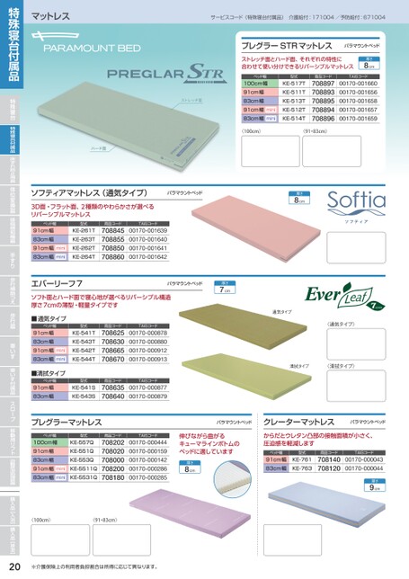※介護保険上の利用者負担割合は所得に応じて異なります。マットレスPREGLARSTRロゴ20220621_パラマウントベッド(株)_デザイン_島田サービスコード(特殊寝台付属品)介護給付:171004/予防給付:671004PANTONE18-4220TPGR92G127B147#5C7F93ストレッチ面プレグラーSTRマットレスパラマウントベッドストレッチ面とハード面、それぞれの特性に合わせて使い分けできるリバーシブルマットレス厚さ8cmベッド幅100cm幅91cm幅83cm幅91cm幅mini83cm幅mini型式KE-517TKE-511TKE-513TKE-512TKE-514T商品コード708897708893708895708894708896TAISコード00170-00166000170-00165600170-00165800170-00165700170-001659〈100cm〉〈91・83cm〉ハード面特殊寝台付属品パラマウントベッド厚さ8cmソフティアマットレス(通気タイプ)3D面・フラット面、2種類のやわらかさが選べるリバーシブルマットレスベッド幅91cm幅83cm幅91cm幅mini83cm幅mini型式KE-261TKE-263TKE-262TKE-264T商品コード708845708855708850708860TAISコード00170-00163900170-00164000170-00164100170-001642エバーリーフ7ソフト面とハード面で寝心地が選べるリバーシブル構造厚さ7cmの薄型・軽量タイプですパラマウントベッド厚さ7cm■通気タイプベッド幅91cm幅83cm幅91cm幅mini83cm幅mini■清拭タイプベッド幅91cm幅83cm幅型式KE-541TKE-543TKE-542TKE-544T商品コード708625708630708665708670TAISコード00170-00087800170-00088000170-00091200170-000913型式KE-541SKE-543S商品コード708635708640TAISコード00170-00087700170-000879プレグラーマットレスベッド幅100cm幅91cm幅83cm幅91cm幅mini83cm幅mini型式KE-557QKE-551QKE-553QKE-5511QKE-5531Q商品コード708202708020708000708200708180TAISコード00170-00044400170-00015900170-00014200170-00028600170-000285〈100cm〉〈91・83cm〉通気タイプ〈通気タイプ〉清拭タイプ〈清拭タイプ〉パラマウントベッド伸びながら曲がるキューマラインボトムのベッドに適しています厚さ8cmクレーターマットレスからだとウレタン凸部の接触面積が小さく、圧迫感を軽減しますパラマウントベッドベッド幅91cm幅83cm幅型式KE-761KE-763商品コード708140708120TAISコード00170-00004300170-000044厚さ9cm20