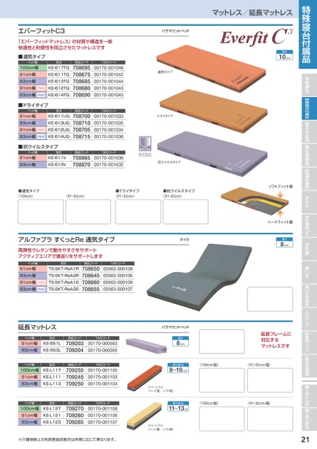 ※介護保険上の利用者負担割合は所得に応じて異なります。特殊寝台付属品厚さ10cmソフトフィット面ハードフィット面厚さ8cmマットレス/延長マットレスエバーフィットC3「エバーフィットマットレス」の材質や構造を一新快適性と利便性を両立させたマットレスです■通気タイプベッド幅100cm幅91cm幅83cm幅91cm幅mini83cm幅mini型式KE-617TQKE-611TQKE-613TQKE-612TQKE-614TQ商品コード708695708675708685708680708690TAISコード00170-00104600170-00104200170-00104400170-00104300170-001045■ドライタイプベッド幅91cm幅83cm幅91cm幅mini83cm幅mini型式KE-611UQKE-613UQKE-612UQKE-614UQ商品コード708700708710708705708715TAISコード00170-00103300170-00103500170-00103400170-001036■抗ウイルスタイプベッド幅91cm幅83cm幅型式KE-611VKE-613V商品コード708865708870TAISコード00170-00163600170-001635パラマウントベッド通気タイプドライタイプ抗ウイルスタイプ●通気タイプ〈100cm〉〈91・83cm〉●ドライタイプ〈91・83cm〉●抗ウイルスタイプ〈91・83cm〉アルファプラすくっとRe通気タイプ高弾性ウレタンで動きやすさをサポートアクティブエリアで寝返りをサポートしますベッド幅91cm幅83cm幅91cm幅mini83cm幅mini型式TS-SKT-ReA1RTS-SKT-ReA3RTS-SKT-ReA1STS-SKT-ReA3S商品コード708650708645708660708655TAISコード00563-00010800563-00010600563-00010900563-000107タイカ延長マットレスベッド幅91cm幅83cm幅型式KE-551LKE-553L商品コード709203709204TAISコード00170-00056300170-000565ベッド幅100cm幅91cm幅83cm幅型式KE-L117KE-L111KE-L113商品コード709255709245709250TAISコード00170-00110500170-00110300170-001104ベッド幅100cm幅91cm幅83cm幅型式KE-L127KE-L121KE-L123商品コード709270709260709265TAISコード00170-00110800170-00110600170-001107延長フレームに対応するマットレスです〈100cm幅〉〈91・83cm幅〉パラマウントベッド厚さ8cm厚さ適合8〜10cmリバーシブル(ハード面/ソフト面)厚さ適合11〜13cm〈100cm幅〉〈91・83cm幅〉リバーシブル(ハード面/ソフト面)21