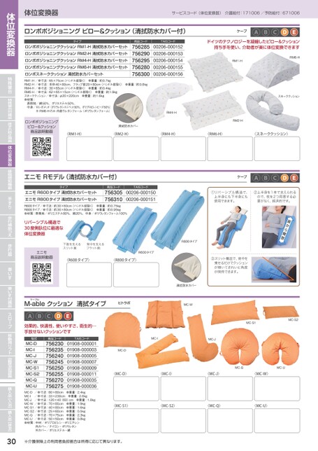 ※介護保険上の利用者負担割合は所得に応じて異なります。体位変換器サービスコード(体位変換器)介護給付:171006/予防給付:671006ロンボポジショニングピロー&クッション(清拭防水カバー付)タイプ商品コードTAISコードロンボポジショニングクッションRM1-H清拭防水カバーセットロンボポジショニングクッションRM2-H清拭防水カバーセットロンボポジショニングクッションRM4-H清拭防水カバーセットロンボポジショニングクッションRM6-H清拭防水カバーセットロンボスネーククッション清拭防水カバーセットRM1-H/●寸法:65×75cm(ハンドル部除く)●重量:約0.7kgRM2-H/●寸法:本体40×80cm、フラップ部20×80cm(ハンドル部除く)●重量:約0.8kgRM4-H/●寸法:30×65cm(ハンドル部除く)●重量:約0.4kgRM6-H/●寸法:62×65×15cm(ハンドル部除く)●重量:約1.9kgスネーククッション/●寸法:φ20×220cm●重量:約1.6kg●材質:756285756290756295756280756300表側地/綿50%、ポリエステル50%、中身/ロンボメッド(ポリウレタンスニペット50%、ポリプロピレンビーズ50%)※RM6-Hのみ内部ウレタンフォーム(ポリウレタンフォーム)00206-00015200206-00015300206-00015400206-00015500206-000156ケープ●●●●●Dドイツのテクノロジーを凝縮したピロー&クッション持ち手を使い、介助者が楽に体位変換できますRM1-HRM6-Hスネーククッションロンボポジショニングピロー&クッション商品説明動画RM4-HRM2-H清拭防水カバー〈RM1-H〉〈RM2-H〉〈RM4-H〉〈RM6-H〉〈スネーククッション〉ケープ●●●●●D①リバーシブル構造で、上半身にも下半身にも使用できます。②上半身を1本で支えられるので、枕を2つ用意する必要がなく、経済的です。③スリット構造で、背中を乗せるだけでクッションが傾いてきれいに角度が保持できます。R800タイプ清拭防水カバーMC-WMC-S1MC-S2エニモRモデル(清拭防水カバー付)タイプ商品コードTAISコード756305エニモR600タイプ清拭防水カバーセット756310エニモR800タイプ清拭防水カバーセットR600タイプ/●寸法:約30×60cm(ハンドル部除く)●重量:約0.75kgR800タイプ/●寸法:約30×80cm(ハンドル部除く)●重量:約0.95kg●材質:表側地/ポリエステル80%、綿20%、中身/ポリウレタンフォーム100%00206-00015000206-000151リバーシブル構造で30度側臥位に最適な体位変換器エニモ商品説明動画下肢を支えるスリット面背中を支えるフラット面R600タイプ〈R600タイプ〉〈R800タイプ〉体位変換器Mマーブル-ableクッション清拭タイプヒトラボ●●●●●効果的、快適性、使いやすさ、衛生的…手放せないクッションです商品コードTAISコード01908-00000101908-00000301908-00000501908-00000701908-00000901908-00001101908-00003501908-000036756230756235756240756245756250756255756270756275型式MC-DMC-IMC-JMC-WMC-S1MC-S2MC-QMC-UMC-D/●寸法:80×80cm●重量:2.4kgMC-IMC-JMC-W/●寸法:70×85cm●重量:1.9kgMC-S1/●寸法:40×80cm●重量:1.6kgMC-S2/●寸法:25×60cm●重量:0.5kgMC-Q/●寸法:70×75cm●重量:2.3kgMC-U/●寸法:50×50cm●重量:0.8kg●材質:中材/ポリプロピレン・ポリエチレン/●寸法:33×230cm●重量:2.6kg/●寸法:120×40(60)cm●重量:1.8kg内カバー/ナイロン・ポリウレタン外カバー/ポリエステル・綿MC-IMC-JMC-D〈MC-D〉〈MC-I〉〈MC-J〉〈MC-W〉MC-QMC-U〈MC-S1〉〈MC-S2〉〈MC-Q〉〈MC-U〉30