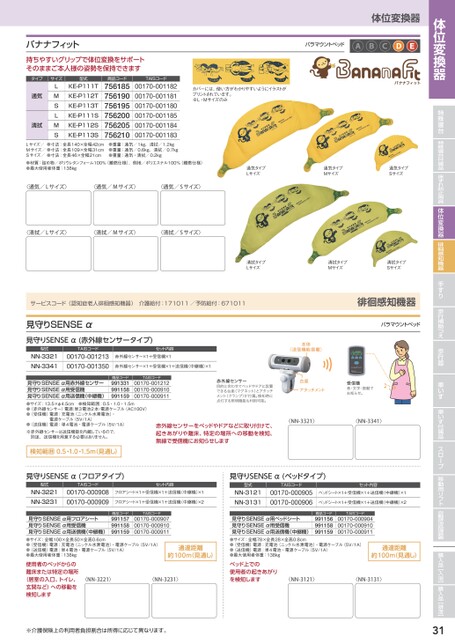 ※介護保険上の利用者負担割合は所得に応じて異なります。体位変換器パラマウントベッド●●●●●バナナフィット持ちやすいグリップで体位変換をサポートそのままご本人様の姿勢を保持できますタイプサイズ型式通気清拭LMSLMSKE-P111TKE-P112TKE-P113TKE-P111SKE-P112SKE-P113S商品コード756185756190756195756200756205756210TAISコード00170-00118200170-00118100170-00118000170-00118500170-00118400170-001183カバーには、使い方がわかりやすいようにイラストがプリントされています。※L・Mサイズのみ徘徊感知機器清拭タイプLサイズ清拭タイプMサイズ清拭タイプSサイズ通気タイプLサイズ通気タイプMサイズ通気タイプSサイズLサイズ/●寸法:全長140×全幅42cmMサイズ/●寸法:全長109×全幅31cmSサイズ/●寸法:全長46×全幅21cm●材質:詰め物/ポリウレタンフォーム100%(難燃仕様)、側地/ポリエステル100%(難燃仕様)●最大使用者体重:138kg●重量:通気/1kg、清拭/1.2kg●重量:通気/0.6kg、清拭/0.7kg●重量:通気・清拭/0.2kg〈通気/Lサイズ〉〈通気/Mサイズ〉〈通気/Sサイズ〉〈清拭/Lサイズ〉〈清拭/Mサイズ〉〈清拭/Sサイズ〉サービスコード(認知症老人徘徊感知機器)介護給付:171011/予防給付:671011見守りSENSEα見守りSENSEα(赤外線センサータイプ)型式NN-3321NN-3341TAISコード00170-00121300170-001350セット内容赤外線センサー×1+受信機×1赤外線センサー×1+受信機×1+送信機(中継機)×1本体(送信機能搭載)徘徊感知機器パラマウントベッド見守りSENSEα用赤外線センサー見守りSENSEα用受信機見守りSENSEα用送信機(中継機)●サイズ:13.5×φ4.5cm●検知範囲:0.5・1.0・1.5m●(赤外線センサー)電源:単3電池2本・電源ケーブル(AC100V)●(受信機)電源:充電池(ニッケル水素電池)・00170-00121200170-00091000170-000911商品コード991331991158991159TAISコード電源ケーブル(5V/1A)●(送信機)電源:単4電池・電源ケーブル(5V/1A)※赤外線センサーは送信機能を内蔵しているので、別途、送信機を用意する必要はありません。赤外線センサー目的に合わせてベッドやドアに設置できる台座(マグネット)とアタッチメント(クランプ)が付属。検知時に点灯する照明機能も利用可能。台座アタッチメント受信機音・文字・振動でお知らせ。♪〜赤外線センサーをベッドやドアなどに取り付けて、起きあがりや離床、特定の場所への移動を検知、無線で受信機にお知らせします〈NN-3321〉〈NN-3341〉検知範囲0.5・1.0・1.5m(見通し)見守りSENSEα(フロアタイプ)型式TAISコードセット内容NN-3221NN-323100170-00090800170-000909フロアシート×1+受信機×1+送信機(中継機)×1フロアシート×1+受信機×1+送信機(中継機)×2見守りSENSEα(ベッドタイプ)型式NN-3121NN-3131TAISコード00170-00090500170-000906セット内容ベッドシート×1+受信機×1+送信機(中継機)×1ベッドシート×1+受信機×1+送信機(中継機)×2TAISコード商品コード99115799115899115900170-00090700170-00091000170-000911見守りSENSEα用フロアシート見守りSENSEα用受信機見守りSENSEα用送信機(中継機)●サイズ:全幅100×全長50×全高0.6cm●(受信機)電源:充電池(ニッケル水素電池)・電源ケーブル(5V/1A)●(送信機)電源:単4電池・電源ケーブル(5V/1A)●最大使用者体重:138kg使用者のベッドからの離床または特定の場所(居室の入口、トイレ、玄関など)への移動を検知します〈NN-3221〉〈NN-3231〉通達距離約100m(見通し)TAISコード商品コード99115699115899115900170-00090400170-00091000170-000911見守りSENSEα用ベッドシート見守りSENSEα用受信機見守りSENSEα用送信機(中継機)●サイズ:全幅78×全長28×全高0.8cm●(受信機)電源:充電池(ニッケル水素電池)・電源ケーブル(5V/1A)●(送信機)電源:単4電池・電源ケーブル(5V/1A)●最大使用者体重:138kgベッド上での使用者の起きあがりを検知します〈NN-3121〉〈NN-3131〉通達距離約100m(見通し)31