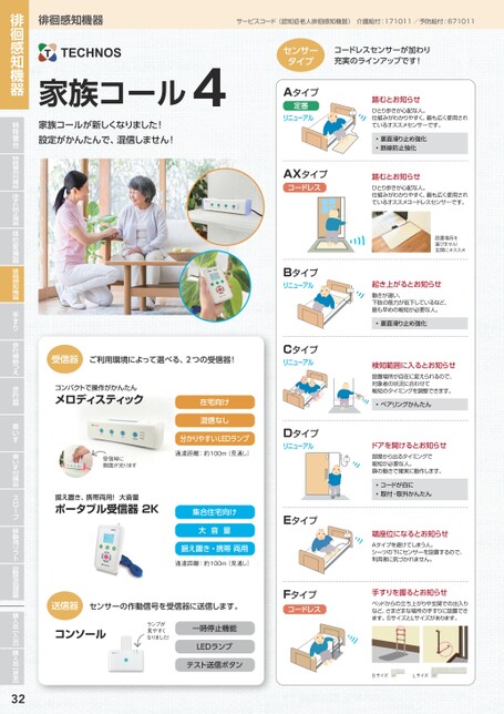 徘徊感知機器サービスコード(認知症老人徘徊感知機器)介護給付:171011/予防給付:671011家族コール4家族コールが新しくなりました!設定がかんたんで、混信しません!受信器ご利用環境によって選べる、2つの受信器!コンパクトで操作がかんたんメロディスティック受信時に側面が光ります据え置き、携帯両用!大音量ポータブル受信器2K在宅向け混信なし分かりやすい LEDランプ通達距離:約100m(見通し)集合住宅向け大 音 量据え置き・携帯 両用通達距離:約100m(見通し)送信器センサーの作動信号を受信器に送信します。コンソールランプが見やすくなりました!一時停止機能LEDランプテスト送信ボタン32センサータイプAタイプ定番リニューアルAXタイプコードレスBタイプリニューアルCタイプリニューアルDタイプリニューアルEタイプコードレスセンサーが加わり充実のラインアップです!踏むとお知らせひとり歩きが心配な人。仕組みがわかりやすく、最も広く使用されているオススメセンサーです。・裏面滑り止め強化・断線防止強化踏むとお知らせひとり歩きが心配な人。仕組みがわかりやすく、最も広く使用されているオススメコードレスセンサーです。設置場所を選びません!玄関にオススメ!起き上がるとお知らせ動きが速い、下肢の筋力が低下しているなど、最も早めの報知が必要な人。・裏面滑り止め強化検知範囲に入るとお知らせ設置場所が自在に変えられるので、対象者の状況に合わせて報知のタイミングを調整できます。・ペアリングかんたんドアを開けるとお知らせ部屋から出るタイミングで報知が必要な人。扉の動きで確実に動作します。・コードが白に・取付・取外かんたん端座位になるとお知らせAタイプを避けてしまう人。シーツの下にセンサーを設置するので、利用者に気づかれません。Fタイプコードレス手すりを握るとお知らせベッドからの立ち上がりや玄関での出入りなど、さまざまな場所の手すりに設置できます。SサイズとLサイズがあります。SサイズLサイズ
