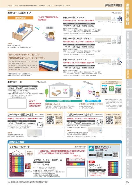 ※介護保険上の利用者負担割合は所得に応じて異なります。サービスコード(認知症老人徘徊感知機器)介護給付:171011/予防給付:671011家族コール3Eタイプ建物内限定ベッド上で端座位になると知らせます家族コール3E・スマートベッドの端によると、スマートKで知らせます型式HKSM-3E商品コード764625TAISコード00318-000189徘徊感知機器テクノスジャパンサイドセンサーKコンソールスマートK●サイズ:80×18×0.4cm●電源:コンソール/9Vアルカリ電池1個またはACアダプタ(AC100V)スマートK/内蔵リチウムイオン電池(専用ワイヤレス充電器)〈セット内容〉サイドセンサーK、コンソール、スマートK家族コール3E・メロディチャイムベッドの端によると、メロディチャイムで知らせます型式HK-3E商品コード764620TAISコード00318-000192サイドセンサーKコンソールメロディチャイム●サイズ:80×18×0.4cm●電源:コンソール/9Vアルカリ電池1個またはACアダプタ(AC100V)メロディチャイム/ACアダプタ(AC100V)〈セット内容〉サイドセンサーK、コンソール、メロディチャイム家族コール3E・ポータブルベッドの端によると、ポータブル受信器Kで知らせます型式HKPT-3E商品コード764630TAISコード00318-000191サイドセンサーKコンソールポータブル受信器K●サイズ:80×18×0.4cm●電源:コンソール/9Vアルカリ電池1個またはACアダプタ(AC100V)ポータブル受信器K/内蔵リチウムイオン電池(バッテリー駆動の場合)AC100V(ACアダプタ付)〈セット内容〉サイドセンサーK、コンソール、ポータブル受信器Kオプション設定用のアプリはQRコードからインストールできます。対象者•転倒リスクが高い方•Aタイプ(床センサー)を避けてしまう方Eタイプはベッドサイドに敷くだけ!対象者に気づかれにくいセンサーです。サイドセンサーKをマットレスの上(ベッドサイド)に設置します。上からベッドパッドやシーツをかぶせられるので、対象者に気づかれにくくセンサーを避けられません。※各受信器の特長は前ページをご参照ください。※家族コールワイドにはEタイプはありません。お散歩コールテクノスジャパン型式OGP-1商品コード764535TAISコード00318-000179●サイズ:お散歩タグ/3.5×7×2.5cm見守ガイド/11.5×6.9×2.8cm〈セット内容〉お散歩タグ、見守ガイド●電源:お散歩タグ/内蔵リチウムイオン電池(専用ワイヤレス充電器)見守ガイド/ACアダプタ(AC100V)GPS*で外出後の徘徊をお知らせします介護保険レンタル対象介護保険レンタル対象外介護保険レンタル対象「お散歩タグ」を取り付けた杖などを持ち出すと、「見守ガイド」のアラーム音でお知らせします。介護保険レンタル対象外(GPS機能)位置情報などの通知をメールでお知らせします。*機器(介護保険対象)のレンタル料に加え、介護保険対象外のオプション利用料(月額330円)が必要です。オプションを利用すると、屋内報知に加え、徘徊後の現在地を家族にメールでお知らせします。コールマット・徘徊コールⅢテクノスジャパン利用者もスタッフも安心して使える離床センサー型式HC-3商品コード764055TAISコード00318-000037●サイズ:マットスイッチ/120×50×0.4cm〈セット内容〉マットスイッチ、中継ボックス中継ボックス対象者•立位保持に不安がある方•ひとり歩きに不安がある方マットスイッチ保険対応外商品くすりコールライト各種ナースコールに対応※QRコードより、ナースコール参照図をご確認いただき、お使いのナースコール番号をご指定ください。ベッドコール・ケーブルタイプテクノスジャパン上体を起こすとナースコールで知らせます!型式BC-2商品コード764500TAISコード00318-000144●サイズ:ベッドセンサー/80×25×0.6cm〈セット内容〉ベッドセンサー、中継ボックス中継ボックス対象者•下肢筋力が低下し転倒リスクが高い方•動きが速く、早めの報知が必要な方※地域によっては対応ができない場合もございます。ベッドセンサー各種ナースコールに対応※QRコードより、ナースコール参照図をご確認いただき、お使いのナースコール番号をご指定ください。テクノスジャパン音と光で服薬時間をお知らせ!1日最大4回、1週間分の服薬時間を音と光でお知らせします!オプションで服薬みまもりアプリが利用できます本体ケースくすりコール・ライト本体ケース型式商品コードKCL-1792605●サイズ:本体ケース/62×38×2.5cm、くすりポケットサイズ/7×5.5cm●重量:約500g●材質:ABS樹脂、PVC●電源:AC100V(ACアダプタ付)または電池(単3×6本)●電池寿命:約6か月*電池使用の場合●設置:付属のヒモおよびフックで壁などに設置※レンタルの場合、別途、搬入搬出料がかかります。大容量の収納ポケット付!服薬みまもりアプリ月額利用料330円(税込)服薬状況をメールでお知らせ購入週間カレンダー(エプロン部分)商品コード218939希望小売価格オープン価格※レンタルの際は、エプロン部分は別途購入になります。35