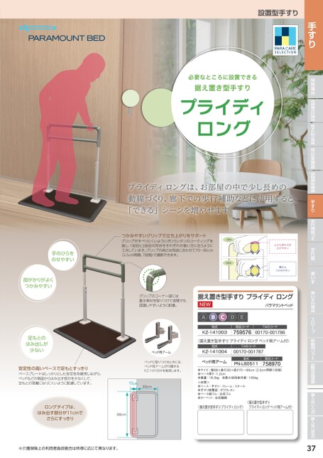 ※介護保険上の利用者負担割合は所得に応じて異なります。設置型手すりプライディロングは、お部屋の中で少し長めの動線づくり、廊下での歩行補助などに使用すると、「できる」シーンを増やせます。つかみやすいグリップで立ち上がりをサポートグリップがすべりにくいようにポリウレタンのコーティングを施し、1段目と2段目の形状をそれぞれの使い方に合うように工夫しています。グリップの高さは用途に合わせて70〜85cm(2.5cm間隔、7段階)で調節できます。1段目2段目上から押す力をかけやすい横からつかみやすいグリップのコーナー部には蓄光素材を取りつけて夜間でも認識しやすいように配慮。据え置き型手すりプライディロングNEWパラマウントベッド手のひらをのせやすい指がかりがよくつかみやすい足もとのはみ出しが少ない安定性の高いベースで足もとすっきりベースプレートはしっかりとした安定性を確保しながら、ベッドなどの側面からはみ出す部分を少なくして、足もとの邪魔になりにくいように配慮しています。ロングタイプは、はみ出す部分が11cmでさらにすっきり●●●●●型式KZ-141003商品コード759576TAISコード00170-001786〈据え置き型手すりプライディロングベッド用アーム付〉型式TAISコードKZ-14100400170-001787ベッド用アーム型式PN-L80511商品コード758970●サイズ:幅88×奥行50×高さ70〜85cm(2.5cm間隔7段階)●ベース厚さ:1.2cm●重量:18.3kg●最大使用者体重:100kg<材質>●ベース・手すり・フレーム:スチール●手すり被覆部:ポリウレタン●ベース縁ゴム:合成ゴム●カーペット:合成繊維〈据え置き型手すりプライディロング〉プライディロングベッド用アーム付〉〈据え置き型手すりベッド用アームベッドに取りつけるときには、ベッド用アームが付属するKZ-141004を推奨します。11cm39cm88cm37