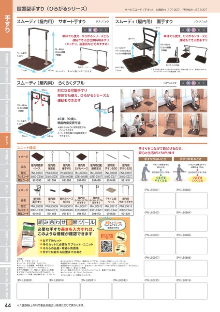 ※介護保険上の利用者負担割合は所得に応じて異なります。設置型手すり(ひろがるシリーズ)サービスコード(手すり)介護給付:171007/予防給付:671007スムーディ(屋内用)サポート手すりパナソニックスムーディ(屋内用)面手すりパナソニック●●●●●単体でも使え、ひろがるシリーズとも連結できる立位保持用手すり(キッチン、洗面所などでおすすめ)ベース厚さ:1.2cm70〜85cm(2.5cm間隔7段階)面手すり手すり●●●●●単体でも使え、ひろがるシリーズと連結もできる面手すり31〜51cm※(ベースからの高さ)※2.5cm間隔9段階70〜85cm(2.5cm間隔7段階)71cm60cm※ベースは、Pトイレ用ベースになります。防水カーペットベース厚さ:1.1cm折りたたみ可能※手すり部と面手すり部の高さは個別に調節可能ですが、制約があります。(メーカーホームページを確認願います)スムーディ(屋内用)らくらくダブルパナソニック●●●●●65cm対になる可動手すり単体でも使え、ひろがるシリーズと連結もできます70〜85cm(2.5cm間隔7段階)ベース厚さ:1.2cm78cm60cmユニット構成イメージ45度、90度に都度角度変更可能※動かないように常時固定することもできます※ベースの外側には角度変更ができません55cm立ち上がり歩き出し移乗動線対応手すりをつなげて延ばせるので、安心と生活がひろがります手すりがないとき手すりがあるとき品名屋内用標準ベース屋内用端支柱屋内用端手すり型式TAISコード商品コードPN-L8080100980-000366PN-L8080200980-000367PN-L8080300980-000368991393991394991395屋内用ミドルベースPN-L8080400980-000369991428屋内用回転連結支柱PN-L8080500980-000370991429屋内用手すり930PN-L8080600980-000371991430屋内用手すり620PN-L8080700980-000372991431バランスを保とうと前かがみンうと前か⬇⬇足があがりにくくなる足があにくなる⬇つまずきやすくなる⬇つまずきやすくなるバランスが保ちやすく姿勢もよくなるラスがすく姿勢もくな⬇⬇足があがりやすくなるすくなる⬇つまずきにくくなる⬇つまずきにくくなるイメージ品名屋内用面手すり屋内用アーム屋内用ベース6078らくらくダブルらくらくダブル屋内用右手すり屋内用左手すりPトイレ用ベース型式TAISコード商品コードPN-L8080800980-000396PN-L8080900980-000397PN-L8081000980-000409PN-L8081100980-000410PN-L8081200980-000411PN-L8081500980-000442991457991458991471991472991473991520〈PN-L80801〉〈PN-L80802〉屋内用サポート手すりPN-L8081600980-000443991521〈PN-L80803〉〈PN-L80804〉<材質>●ベース・下支柱:スチール●ジョイント・手すり芯材:アルミニウム●カーペット:合成繊維●平面部:ポリエチレン●支柱カラー・ネジカバー:ポリプロピレン●手すり被覆部・ベース縁ゴム:塩化ビニル樹脂●上支柱:アルミニウム(らくらくダブルはスチール)●支柱カバー・被覆(回転連結支柱):エラストマー●サポート手すり(下支柱)、昇降手すり(下支柱、ひじ掛け(芯材))ベース:スチール●昇降手すり(中支柱・上支柱)、サポート手すり(上支柱・手すり(芯材)):アルミニウム●昇降手すり(ひじ掛けカバー・支柱カラー・スライドカバー)サポート手すり(支柱カラー):ポリプロピレン●ベース縁ゴム:塩化ビニル樹脂●マット:表面ポリエステル・ポリエチレンコーティング、裏面アクリル樹脂●トイレサポート:ポリブチレンテレフタレート※Pトイレ用ベース:実際はマット付です。〈PN-L80805〉〈PN-L80806〉〈PN-L80807〉〈PN-L80808〉〈PN-L80809〉〈PN-L80810〉〈PN-L80811〉〈PN-L80812〉〈PN-L80815〉〈PN-L80816〉44