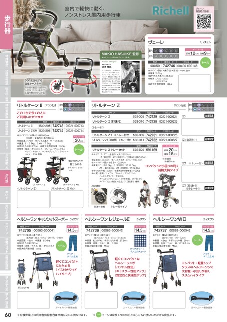 室内で軽快に動く、ノンストレス屋内用歩行車ヴェーレ商品紹介動画ヴェーレ屋内屋外●●●●●●●●●●CDEリッチェルキャスター径前輪12cm、後輪9cm型式40059商品コード742746TAISコード00426-000146トール●サイズ:幅61×奥行58×高さ81〜91.5cm●重量:6.1kg●折りたたみ奥行:34.5cm●材質:アルミ・ABSポリエステル●最大使用者体重:80kg360度回転する自在キャスターその場で旋回できるので、小回りしやすく、車体が手繰り寄せやすいです。リトルターンⅡアロン化成この1台で多くの人にご利用いただけますタイプ型式532-295リトルターンⅡ532-296リトルターンⅡKM●サイズ:Ⅱ/全幅48×奥行65cm屋内屋外●●●●●●●●●●商品コード742743742744TAISコード00221-00071300221-000714ⅡKM/全幅50×奥行65cm●座面高:47cm●ハンドル高さ:74〜96.5cm●重量:Ⅱ/6.9kg、ⅡKM/7.5kg●折りたたみ幅:27cm●最大使用者体重:100kg●材質:座面/ポリエステル、フレーム/アルミニウムバッグ/ナイロン、ハンドルグリップ/エラストマータイヤ/EVA樹脂キャスター径20cmトール買い物かごが載せられる※リトルターンⅡKMのみリトルターンⅡリトルターンⅡKM〈リトルターンⅡ〉〈リトルターンⅡKM〉リトルターンZタイプリトルターンZリトルターンZ(抑速付)〈トレー付〉アロン化成型式532-308532-310商品コード742729742730TAISコード00221-00062400221-000626〈Z〉屋内屋外●●●●●●●●●●在庫限定タイプ型式リトルターンZT※トレー付きリトルターンZT(抑速付)※トレー付き532-309532-311型式592-609リトルターンZトレーセット●サイズ:Z・ZT/全幅51×奥行62.5cmZ(抑速付)・ZT(抑速付)/全幅51×奥行65cm●座面高:53.5cm●ハンドル高さ:87.5〜107.5cm●アームレスト高さ:82.5〜102.5cm●重量:Z/約9.5kg、Z(抑速付)/約11.0kgZT/約10.5kg、ZT(抑速付)/約12.0kg●折りたたみ幅:39cm●最大使用者体重:100kg●材質:座面/ナイロン、フレーム/アルミニウムハンドルグリップ/合成ゴムアームレストクッション/EVA樹脂、ポリウレタンタイヤ/EVA樹脂・合成ゴム(抑速付後輪)商品コード742731742732商品コード991469TAISコード00221-00062500221-000627キャスター径前輪20cm後輪15cm※抑速付後輪20cmコンパクトで小回りの利く前腕支持タイプ〈Z(抑速付)〉在庫限定〈ZT※トレー付〉在庫限定Z抑速付〈ZT(抑速付)※トレー付〉在庫限定抑速付後輪トレー付タイプZヘルシーワンキャンシットヌーボーウィズワンヘルシーワンレジェールⅡ商品コードTAISコード742705●サイズ:幅56×奥行65×00063-000041●座面高:48cm●重量:5.35kg●折りたたみ幅:32cm●材質:本体/アルミ、袋/ポリエステル●最大使用者体重:75kg高さ83・85.5・87.5・90・92・94cmトールキャスター径14.5cm商品コードTAISコード742736●サイズ:幅53×奥行52×00063-000042高さ75.5・78.5・81.5・84.5cm●重量:約3.97kg●折りたたみ幅:27.5cm●材質:本体/アルミ、袋/ナイロン●最大使用者体重:75kgウィズワンキャスター径14.5cmバッグ:デニム生地軽くてコンパクトにたためる「イス付きワイドハイタイプ」バッグカラー:ギンガムチェック軽くてコンパクトなヘルシーワンが「ハンドル固定」「キャスター性能アップ」「安定性と快適性アップ」ヘルシーワンWⅡ商品コードTAISコード742737●サイズ:幅54×奥行55×00063-000043高さ84・87・90・93cm●重量:4.6kg●折りたたみ幅:26cm●材質:本体/アルミ、袋/ポリエステル●最大使用者体重:75kgウィズワンキャスター径14.5cmトールバッグ:デニム生地コンパクト・軽量トップクラスのヘルシーワンに大容量・小回りが利くスリムハイタイプ折りたたみ時60※介護保険上の利用者負担割合は所得に応じて異なります。※ トール マークは身長170cm以上の方にもお使いいただける商品です。ガードカバー標準装備ガードカバー標準装備ガードカバー標準装備