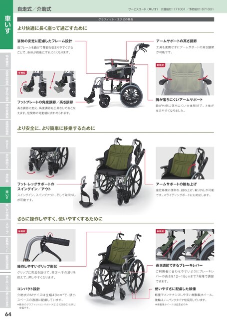 自走式/介助式サービスコード(車いす)介護給付:171001/予防給付:671001グラフィット・エグゼの特長より快適に長く座って過ごすために姿勢の安定に配慮したフレーム設計座フレームを曲げて臀部を収まりやすくすることで、身体が前後にずれにくくなります。新機能フットプレートの角度調節/高さ調節高さ調節に加え、角度調節も工具なしでおこなえます。足関節の可動域に合わせられます。より安全に、より簡単に移乗するためにアームサポートの高さ調節工具を使用せずにアームサポートの高さ調節が可能です。新機能腕が落ちにくいアームサポート腕が外側に落ちにくい立体形状で、上体が支えやすくなりました。フット・レッグサポートのスイングイン/アウトスイングイン、スイングアウト、そして取り外しが可能です。アームサポートの跳ね上げ座位移乗に便利な、跳ね上げ、取り外しが可能です。スライディングボードにも対応します。さらに操作しやすく、使いやすくするために新機能新機能操作しやすいグリップ形状グリップに突起を設けて、前方へ手の滑りを抑えて、押しやすくなります。コンパクト設計介助式のMサイズは全幅48cm*で、狭小スペースの通過に配慮しています。*既存のグラフィットコンパクト(KZ-212880)と同じ全幅です。64長さ調節できるブレーキレバーご利用者に合わせやすいようにブレーキレバーの長さを12〜18cmまで7段階で調節できます。使いやすさに配慮した装備軽量でメンテナンスしやすい樹脂製ホイール。後輪はノーパンクタイヤを採用しています。※樹脂製ホイールは自走式のみ