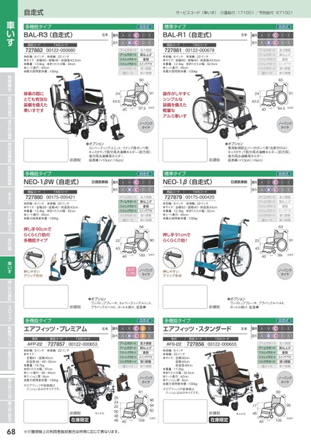 ※介護保険上の利用者負担割合は所得に応じて異なります。自走式多機能タイプBAL-R3(自走式)商品コードTAISコード00122-000680727882●前輪:6インチ●後輪:22インチ●サイズ:全幅60・座幅40・前座高43.5cm●重量:13.9kg●折りたたみ幅:34cm●シート奥行:40cm●最大使用者体重:100kg移乗の際にとても有効な装備を備えた車いすですサービスコード(車いす)介護給付:171001/予防給付:671001自走式ミキ屋内屋外●●●●●C●●●●●アームサポートアームサポートフット・レッグサポートフット・レッグサポートバックサポート座シート高さ調整跳ね上げ着脱スイングアウト張り調整奥行調整60標準タイプBAL-R1(自走式)商品コードTAISコード00122-000678727881●前輪:6インチ●後輪:22インチ●サイズ:全幅60・座幅40・前座高43.5cm●重量:12.3kg●折りたたみ幅:32.5cm●シート奥行:40cm●最大使用者体重:100kg2443.5914097.5(cm)操作がしやすくシンプルな装備を備えた軽量なアルミ車いすノーパンクタイヤ自走式ミキ屋内屋外●●●●●C●●●●●アームサポートアームサポートフット・レッグサポートフット・レッグサポートバックサポート座シート高さ調整跳ね上げ着脱スイングアウト張り調整奥行調整602443.5914094.5(cm)ノーパンクタイヤ●オプションエレベーティングユニット、ウイング用ボンベ架、キャスタラック取付用点滴棒ホルダー(前方用)、後方用点滴棒用ホルダー、延長棒(+10cm)(+5cm)非課税●オプション専用転倒防止バー付ボンベ架(右取付のみ)、キャスタラック取付用点滴棒ホルダー(前方用)、後方用点滴棒用ホルダー、延長棒(+10cm)(+5cm)非課税多機能タイプNEO-1βW(自走式)商品コードTAISコード00175-000421727880●前輪:6インチ●後輪:22インチ●サイズ:全幅58・座幅40・前座高43cm●重量:13.4kg●折りたたみ幅:32cm●シート奥行:40cm●最大使用者体重:100kg押し手90cmでらくらく介助の多機能タイプ押しやすいグリップ形状自走式日進医療器屋内屋外●●●●●C●●●●●アームサポートアームサポートフット・レッグサポートフット・レッグサポートバックサポート座シート高さ調整跳ね上げ着脱スイングアウト張り調整奥行調整58標準タイプNEO-1β(自走式)商品コードTAISコード00175-000420727879●前輪:6インチ●後輪:22インチ●サイズ:全幅63・座幅40・前座高43cm●重量:12.3kg●折りたたみ幅:32cm●シート奥行:40cm●最大使用者体重:100kg押し手91cmでらくらく介助!90224340100(cm)スイングイン・アウトノーパンクタイヤ押しやすいグリップ形状自走式日進医療器屋内屋外●●●●●C●●●●●アームサポートアームサポートフット・レッグサポートフット・レッグサポートバックサポート座シート高さ調整跳ね上げ着脱スイングアウト張り調整奥行調整632243914099(cm)ノーパンクタイヤ●オプションワンストップブレーキ、エレベーティングユニット、プラバックルベルト、ガートル掛け、延長棒非課税●オプションワンストップブレーキ、プラバックルベルト、ガートル掛け、延長棒非課税多機能タイプエアフィッツ・スタンダード型式AFS-22商品コード727856TAISコード00122-000655●前輪:6インチ●後輪:22インチ●サイズ:全幅60cm座幅40cm前座高48cm●重量:17.2kg●折りたたみ幅:32.5cm●シート奥行:42cm●クッション厚:8cm●最大使用者体重:100kg※エアフィッツの前座高はクッション込みのサイズです。自走式ミキ屋内屋外●●●●●C●●●●●アームサポートアームサポートフット・レッグサポートフット・レッグサポートバックサポート座シート高さ調整跳ね上げ着脱スイングアウト張り調整奥行調整ノーパンクタイヤ609540(cm)1051748キャメル非課税在庫限定多機能タイプエアフィッツ・プレミアム型式AFP-22商品コード727857TAISコード00122-000653●前輪:6インチ●後輪:22インチ●サイズ:全幅61・座幅40cm前座高46・48・50cm●重量:19.7kg●折りたたみ幅:37cm●シート奥行:38・44cm●クッション厚:8cm●最大使用者体重:100kg※エアフィッツの前座高はクッション込みのサイズです。自走式ミキ屋内屋外●●●●●●●●●●アームサポートアームサポートフット・レッグサポートフット・レッグサポートバックサポート座シート高さ調整跳ね上げ着脱スイングアウト張り調整奥行調整ノーパンクタイヤ6196・94・9240(cm)10926・24・2250・48・46非課税在庫限定キャメル68