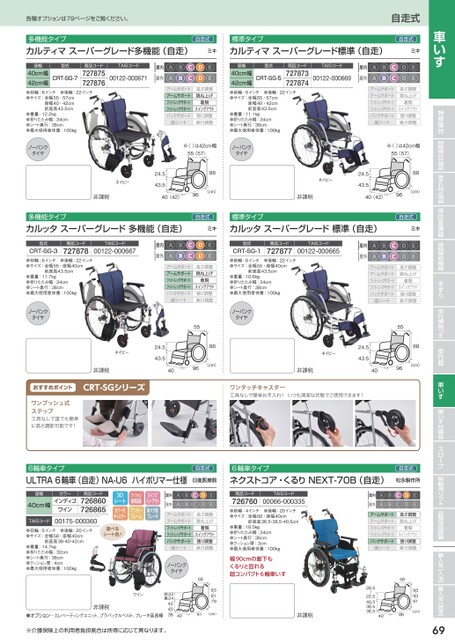 ※介護保険上の利用者負担割合は所得に応じて異なります。5895・93・9140(cm)866928.540.5・38.5・36.52.5〜2屋内屋外●●●●●C●●●●●アームサポートアームサポートフット・レッグサポートフット・レッグサポートバックサポート座シート高さ調整跳ね上げ着脱スイングアウト張り調整奥行調整各種オプションは79ページをご覧ください。自走式多機能タイプカルティマスーパーグレード多機能(自走)自走式ミキ標準タイプカルティマスーパーグレード標準(自走)自走式ミキ座幅型式商品コードTAISコード00122-000671727875727876CRT-SG-740cm幅42cm幅●前輪:6インチ●後輪:22インチ●サイズ:全幅55・57cm座幅40・42cm前座高43.5cm●重量:12.2kg●折りたたみ幅:34cm●シート奥行:38cm●最大使用者体重:100kg屋内屋外●●●●●●●●●●アームサポートアームサポートフット・レッグサポートフット・レッグサポートバックサポート座シート高さ調整跳ね上げ着脱スイングアウト張り調整奥行調整座幅型式商品コードTAISコード00122-000669727873727874CRT-SG-540cm幅42cm幅●前輪:6インチ●後輪:22インチ●サイズ:全幅55・57cm座幅40・42cm前座高43.5cm●重量:11.1kg●折りたたみ幅:34cm●シート奥行:38cm●最大使用者体重:100kg屋内屋外●●●●●●●●●●アームサポートアームサポートフット・レッグサポートフット・レッグサポートバックサポート座シート高さ調整跳ね上げ着脱スイングアウト張り調整奥行調整ノーパンクタイヤ※〈〉は42cm幅55〈57〉ノーパンクタイヤネイビー24.543.5非課税40〈42〉88(cm)96ネイビー24.543.5非課税40〈42〉※〈〉は42cm幅55〈57〉88(cm)96多機能タイプカルッタスーパーグレード多機能(自走)自走式ミキ標準タイプカルッタスーパーグレード標準(自走)自走式ミキ型式CRT-SG-3商品コード727878TAISコード00122-000667●前輪:6インチ●後輪:22インチ●サイズ:全幅55・座幅40cm前座高43.5cm●重量:11.7kg●折りたたみ幅:34cm●シート奥行:38cm●最大使用者体重:100kg屋内屋外●●●●●●●●●●アームサポートアームサポートフット・レッグサポートフット・レッグサポートバックサポート座シート高さ調整跳ね上げ着脱スイングアウト張り調整奥行調整型式CRT-SG-1商品コード727877TAISコード00122-000665●前輪:6インチ●後輪:22インチ●サイズ:全幅55・座幅40cm前座高43.5cm●重量:10.6kg●折りたたみ幅:34cm●シート奥行:38cm●最大使用者体重:100kg屋内屋外●●●●●●●●●●アームサポートアームサポートフット・レッグサポートフット・レッグサポートバックサポート座シート高さ調整跳ね上げ着脱スイングアウト張り調整奥行調整ノーパンクタイヤネイビー24.543.5非課税おすすめポイントCRT-SGシリーズワンプッシュ式ステップ工具なしで誰でも簡単に高さ調節可能です!ノーパンクタイヤ558840(cm)96非課税ネイビー24.543.5558840(cm)96ワンタッチキャスター工具なしで簡単お手入れ!いつも清潔な状態でご使用できます!6輪車タイプULTRA6輪車(自走)NA-U6ハイポリマー仕様自走式日進医療器6輪車タイプネクストコア・くるりNEXT-70B(自走)自走式松永製作所座幅40cm幅カラーインディゴワイン商品コード726860726865TAISコード00175-0003603Dシートカバー付キャスタークッション標準装備アンカーフレームスイングイン・アウト楽々介助ブレーキ選べるシート色!●前輪:5インチ●後輪:20インチ●サイズ:全幅58・座幅40cm前座高38・40・42cm●重量:14.7kg●折りたたみ幅:32cm●シート奥行:38cm●クッション厚:4cm●最大使用者体重:100kg屋内屋外●●●●●C●●●●●アームサポートアームサポートフット・レッグサポートフット・レッグサポートバックサポート座シート高さ調整跳ね上げ着脱スイングアウト張り調整奥行調整ノーパンクタイヤ商品コードTAISコード00066-000335726760●前輪:4インチ●後輪:20インチ●サイズ:全幅58・座幅40cm前座高36.5・38.5・40.5cm●重量:18.5kg●折りたたみ幅:34cm●シート奥行:36cm●クッション厚:3cm●最大使用者体重:100kg幅90cmの廊下もくるりと回れる超コンパクト6輪車いす5883・81・794091(cm)非課税ワイン非課税●オプション…エレベーティングユニット、プラバックルベルト、ブレーキ延長棒前22奥2442・40・38