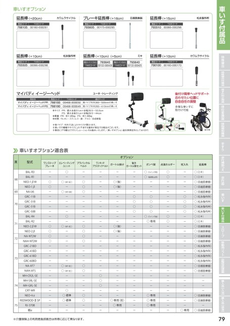 ※介護保険上の利用者負担割合は所得に応じて異なります。車いすオプション頁型式オプションワンストップブレーキエレベーティングユニットプラバックルベルトワンタッチプラスチックベルトガートル掛け後方ガートル架セットボンベ架点滴ホルダー杖入れ延長棒68BAL-R3-○----○(ウイング用)○-○(ミキ)BAL-R1------○(転倒防止用)○-○(ミキ)NEO-1βW○○(KF-EC)○-○(後)----○(日進医療器)NEO-1β○-○-○(後)----○(日進医療器)69NA-U6-○(KF-EB)○------○(日進医療器)70GRC-11B-----○○-○○(松永製作所)GRC-31B-----○○-○○(松永製作所)GRC-51B-----○○-○○(松永製作所)GRC-50B-----○○-○○(松永製作所)71BAL-R4-○----○(ウイング用)○-○(ミキ)BAL-R2------○専用○-○(ミキ)NEO-2βW○○(KF-EC)○-○(後)----○(日進医療器)NEO-2β○-○-○(後)----○(日進医療器)72NA-NT2W○-○------○(日進医療器)NAH-NT2W○-○------○(日進医療器)73GRC-21BD---------○(松永製作所)GRC-41BD---------○(松永製作所)GRC-61BD---------○(松永製作所)GRC-60BD---------○(松永製作所)NA-XF7-○(KF-EC)○------○(日進医療器)NAH-XF5-○(KF-EC)○------○(日進医療器)74MH-CR2L-SE---○------MH-SRL-SE---○------MH-GRL-SE---○------CRT-WR-○--------NEO-4α-○標準○---○専用--○(日進医療器)75REDWOOD-ⅢSP-○標準○-○専用(前)-○専用--○(日進医療器)RJ-370B----○専用-○専用---軽e--------○専用○(日進医療器)車いすオプション適合表延長棒(+10cm)松永製作所延長棒(+10cm)(+5cm)ミキ延長棒(+20cm)カワムラサイクル延長棒(+10cm)カワムラサイクルブレーキ延長棒(+16cm)日進医療器延長棒(+15cm)松永製作所商品コード765505TAISコード00066-000298商品コード(+10cm)765645商品コード(+5cm)765640TAISコード00122-000426TAISコード00122-000425商品コード766100TAISコード00160-000170商品コード765605TAISコード00175-000285商品コード766105TAISコード00160-000261商品コード765510TAISコード00066-000298マイバディイージーヘッドユーキ・トレーディング商品名766180商品コード766185TAISコード適応サイズマイバディイージーヘッドPSマイバディイージーヘッドPR00468-00005000468-000049背パイプ外外360〜500mmの車いす背パイプ外外265〜410mmの車いす●サイズ:PR/最大全高51cm×全幅39.5〜53.5cmPS/最大全高51cm×全幅29.5〜44cm●重量:PR/約1.95kg、PS/約1.88kg●材質:ウレタン・ステンレス・鉄・アルミ・合成樹脂※車いすの機種やサイズにより干渉する箇所が発生する場合がございます。※背パイプ:外外寸法によりサイズが異なります。※事前にデモ機などでのシミュレーションをお勧めいたします。(車いすオプション適合表表記外としております)多様な車いすに後付け簡単ヘッドサポート合わせたい位置に自由自在の調整取付け可能取付例79