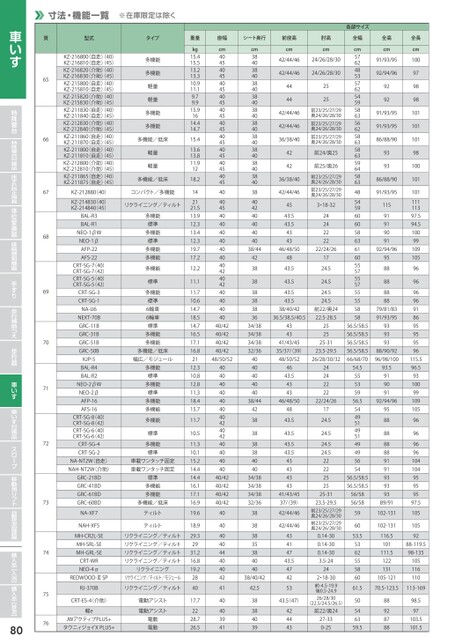 車いす特殊寝台自動排泄処理装置特殊寝台付属品床ずれ防止用具体位変換器車いす手すり歩行補助つえ歩行器車いす付属品スロープ移動用リフト徘徊感知機器購入品【排泄】購入品【入浴】寸法・機能一覧※在庫限定は除く各部サイズ座幅シート奥行前座高肘高cmcm3840384038403840384038403840384038403840384042404040404238383838383634/3834/3834/3832/364040404040頁656667686970717273747576型式KZ-216800(自走)(40)KZ-216810(自走)(45)KZ-216820(介助)40)KZ-216830(介助)45)KZ-215800(自走)(40)KZ-215810(自走)(45)KZ-215820(介助)40)KZ-215830(介助)45)KZ-211830(自走)(40)KZ-211840(自走)(45)KZ-212830(介助)40)KZ-212840(介助)45)KZ-211860(自走)(40)KZ-211870(自走)(45)KZ-211800(自走)(40)KZ-211810(自走)(45)KZ-212800(介助)40)KZ-212810(介助)45)KZ-211865(自走)(40)KZ-211875(自走)(45)KZ-212880(40)KZ-214830(40)KZ-214840(45)タイプ多機能多機能軽量軽量多機能多機能多機能/低床軽量軽量多機能/低床コンパクト/多機能リクライニング/ティルトBAL-R3BAL-R1NEO-1βWNEO-1βAFP-22AFS-22CRT-SG-7(40)CRT-SG-7(42)CRT-SG-5(40)CRT-SG-5(42)CRT-SG-3CRT-SG-1NA-U6NEXT-70BGRC-11BGRC-31BGRC-51BGRC-50BKJP-5BAL-R4BAL-R2NEO-2βWNEO-2βAFP-16AFS-16CRT-SG-8(40)CRT-SG-8(42)CRT-SG-6(40)CRT-SG-6(42)CRT-SG-4CRT-SG-2多機能標準多機能標準多機能多機能多機能標準多機能標準6輪車6輪車標準多機能多機能多機能/低床幅広/モジュール多機能標準多機能標準多機能多機能多機能標準多機能標準NA-NT2W(自走)NAH-NT2W(介助)車載ワンタッチ固定車載ワンタッチ固定GRC-21BDGRC-41BDGRC-61BDGRC-60BDNA-XF7NAH-XF5MH-CR2L-SEMH-SRL-SEMH-GRL-SECRT-WRNEO-4α標準多機能多機能多機能/低床ティルトティルトリクライニング/ティルトリクライニング/ティルトリクライニング/ティルトリクライニング/ティルトリクライニングREDWOOD-ⅢSPリクライニング/ティルト/モジュールRJ-370Bリクライニング/ティルトCRT-ES-4介助)軽eJWアクティブPLUS+タウニィジョイXPLUS+電動アシスト電動アシスト電動電動重量kg15.415.513.213.310.911.19.79.915.91614.414.715.413.613.811.91218.2142121.513.912.313.412.319.717.212.211.111.710.614.718.514.716.517.116.82112.310.812.811.318.415.711.710.511.310.115.214.414.416.117.116.919.618.929.32931.216.819.2284017.72228.726.580cm4045404540454045404540454045404540454045404045404040404040404240424040404040/4240/4240/4240/4248/50/52404040404040404240424040404040/4240/4240/4240/4240404040444040424140403941cm42/44/4624/26/28/3042/44/4624/26/28/30444442/44/4642/44/4636/38/40424236/38/4042/44/464543.543.543432525前23/25/27/29奥24/26/28/30前23/25/27/29奥24/26/28/30前23/25/27/29奥24/26/28/30前24/奥25前25/奥26前23/25/27/29奥24/26/28/30前23/25/27/29奥24/26/28/303・18-3224242222全幅cm5762485357625459586356625863586359645863485459606058636160555755575555585838/4446/48/5022/24/264843.543.543.543.51724.524.524.524.538/40/4236.5/38.5/40.5前22/奥2422.5-28.5434341/43/45252525-3135/37/39)23.5-29.548/50/5226/28/30/3256.5/58.556.5/58.556.5/58.556.5/58.566/68/704643.543432424222238/4446/48/5022/24/264238383838404034/3834/3834/3832/363838383538404038/40/4242.5383840394843.543.543.543.5434343431724.524.524.524.52222252541/43/4537/39)42/44/4642/44/4625-3123.5-29.5前23/25/27/29奥24/26/28/30前23/25/27/29奥24/26/28/3043414743.547425343.5(47)4244430.14-300.14-300.14-303.5-24242・18-30前-4.5-19.9後0.5-24.926/28/30(22.5/24.5/26.5)前22/奥2427-330-2554.555535956.554495149514949565456.5/58.556.5/58.556/5856/58596053.5536255586061.550546359.5全高cm91/93/9592/94/96929291/93/9591/93/9586/88/90939386/88/9091/93/951159191909192/94/96958888888879/81/8391/93/9593939388/90/9296/98/10093.591909192/94/969588888888919193939389/91102-131102-131116.5101111.5122131105-121全長cm1009798981011011019810010110111111397.594.51009910910596969696918695959596115.596.593100991091059696969610410495959597.51051059288-119.598-13510511611070.5-123.5113-1698892878898.597103.5101.5