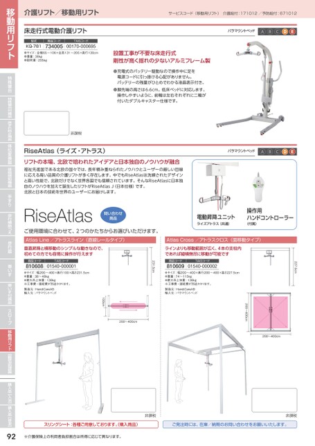 ※介護保険上の利用者負担割合は所得に応じて異なります。介護リフト/移動用リフト床走行式電動介護リフト型式KQ-781商品コード734005TAISコード00170-000695●サイズ:全幅65〜106×全高131〜205×奥行130cm●重量:38kg●耐荷重:205kgサービスコード(移動用リフト)介護給付:171012/予防給付:671012パラマウントベッド●●●●●設置工事が不要な床走行式剛性が高く揺れの少ないアルミフレーム製●充電式のバッテリー駆動なので操作中に足を電源コードに引っ掛ける心配がありません。バッテリーの残量がひとめでわかる液晶表示付き。●脚先端の高さは6.6cm。低床ベッドに対応します。操作しやすいように、前輪は左右それぞれに二輪が付いたダブルキャスター仕様です。非課税RiseAtlas(ライズ・アトラス)リフトの本場、北欧で培われたアイデアと日本独自のノウハウが融合福祉先進国である北欧の国々では、長年積み重ねられたノウハウとユーザーの厳しい目線に応える高い品質の介護リフトが多く存在します。中でもRiseAtlasは洗練されたデザインと高い性能で、北欧だけでなく世界各国でも信頼されています。そんなRiseAtlasに日本独自のノウハウを加えて誕生したリフトがRiseAtlasJ(日本仕様)です。北欧と日本の技術を世界のユーザーにお届けします。パラマウントベッド●●●●●問い合わせ商品電動昇降ユニットライズアトラス(共通)操作用ハンドコントローラー(付属)ご使用環境に合わせて、2つのかたちからお選びいただけます。AtlasLine/アトラスライン(直線レールタイプ)AtlasCross/アトラスクロス(面移動タイプ)227.5cmラインよりも移動範囲が広く、4本の支柱内であれば縦横無尽に移動が可能です商品コードTAISコード01540-000002810609●サイズ:幅200〜400×奥行200〜400×高さ227.5cm●重量:74〜115kg●最大吊上体重:138kg※工事費・諸経費が別途かかります。製造元:HandiCareAB輸入元:パラマウントベッド231.5cm垂直昇降と横移動のシンプルな動きなので、初めての方でも容易に操作が行えます商品コードTAISコード01540-000001810608●サイズ:幅200〜400×奥行100×高さ231.5cm●重量:38〜48kg●最大吊上体重:138kg※工事費・諸経費が別途かかります。製造元:HandiCareAB輸入元:パラマウントベッド200〜400cm200〜400cm200〜400cm100cmスリングシート:各種ご用意しております。(購入商品)ご発注時には、在庫/納期のお問い合わせをお願いいたします。非課税非課税移動用リフト92