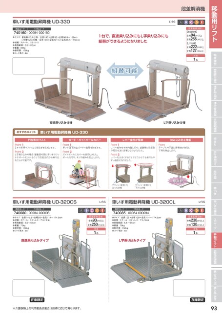 ※介護保険上の利用者負担割合は所得に応じて異なります。車いす用電動昇降機UD-330商品コードTAISコード00084-000150L字乗り込み仕様/全長123×全幅121.5×全高96.5〜156cm740160●サイズ:直進乗り込み仕様/全長150×全幅93×全高96.5〜156cm●材質:スチール、ステンレス●昇降範囲:5.5〜65cm●重量:98kg●耐荷重:150kg●コード長さ:4m1台で、直進乗り込みにもL字乗り込みにも組替ができるようになりました段差解消機いうら●●●●●設置面積(目安)【直進仕様】全幅94cm以上全長255cm以上【L字仕様】全幅222cm以上全長127cm以上定員1名直進乗り込み仕様L字乗り込み仕様おすすめポイント車いす用電動昇降機UD-330門型形状マストPoint12本の昇降マストにより揺らぎを低減します。Point2L字乗り込みの場合、駆動部の間に車いすのフットサポートを入れることで前進方向から乗り込むことが可能です。ガード・ガイドポールカバーPoint1車いす落下防止ガードで脱輪を防ぎます。Point2ガイドポールにカバーを採用しました。ポールを守り、ネジの緩みを防止します。レバー操作が簡単Point1レバー操作を本体内側に収め、設置時に段差側の開口寸法に影響しなくなりました。Point2レバーを大きくすることでどこからでも操作しやすい設計になりました。挟み込み防止機能Pointテーブルの下面に障害物があると下降を停止します。ブリッジ(家側)を立てた状態ブリッジ(家側)を下げた状態障害物車いす用電動昇降機UD-320CSいうら車いす用電動昇降機UD-320CLいうら商品コードTAISコード00084-000093740080●サイズ:全長145.5×全幅93×全高114〜174.5cm●材質:スチール・ステンレス・アルミ合金●昇降範囲:5.5〜65cm●重量:75kg●耐荷重:150kg●コード長さ:4m●●●●●設置面積(目安)全幅93cm以上全長250cm以上定員1名商品コードTAISコード00084-000094740085●サイズ:全長126×全幅129×全高114〜174.5cm●材質:スチール・ステンレス・アルミ合金●昇降範囲:5.5〜65cm●重量:79kg●耐荷重:150kg●コード長さ:4m●●●●●設置面積(目安)全幅230cm以上全長130cm以上定員1名直進乗り込みタイプL字乗り込みタイプ在庫限定在庫限定93