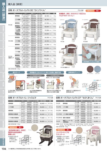 ※介護保険上の利用者負担割合は所得に応じて異なります。購入品【排泄】安寿ポータブルトイレFX-30“らくゾウくん”アロン化成介護保険対応購入希望小売価格重量40,150円(税込)13kg移乗動作、排泄、片付けの3つを支えるマルチサポートトイレ!46,750円(税込)13kgミストブルーアースブラウン57,750円(税込)13.5kg66,000円(税込)13.5kg73,700円(税込)13.5kg82,500円(税込)14kg34,100円(税込)12.5kg40,700円(税込)12.5kgFX-30FX-30SFX-30型式標準便座ソフト便座暖房便座標準便座・快適脱臭ソフト便座・快適脱臭暖房便座・快適脱臭標準便座FX-30Sソフト便座暖房便座標準便座ソフト便座暖房便座FX-30自動ラップ標準便座・快適脱臭ソフト便座・快適脱臭暖房便座・快適脱臭●最大使用者体重:100kgカラーアースブラウンミストブルーアースブラウンミストブルーアースブラウンミストブルーアースブラウンミストブルーアースブラウンミストブルーアースブラウンミストブルーアースブラウンミストブルーアースブラウンミストブルーアースブラウンミストブルーアースブラウンミストブルーアースブラウンミストブルーアースブラウンミストブルーアースブラウンミストブルーアースブラウンミストブルーアースブラウンミストブルー商品コード223177223178223179223180223181223182223183223184223185223186223187223188223171223172223173223174223175223176223189223190223191223192223193223194223195223196223197223198223199223200メーカー品番532-956532-957532-958532-959532-960532-961532-962532-963532-964532-965532-966532-967532-950532-951532-952532-953532-954532-955532-968532-969532-970532-971532-972532-973532-974532-975532-976532-977532-978532-97951,700円(税込)13kg144,650円(税込)17.5kg151,250円(税込)17.5kg162,250円(税込)18.5kg170,500円(税込)18kg178,200円(税込)18kg187,000円(税込)19kg青字は自動ラップ909~7906~7(cm)6053495~3498~3ハイポジション:6・12〜30ノーマルポジション:0・6〜24前傾することで前傾することで前傾することで腹圧をかけて腹圧をかけて腹圧をかけて排泄を促します排泄を促します排泄を促します前傾することで腹圧をかけて排泄を促します前傾することで腹圧をかけて排泄を促します側方ガー側ド側方ガード側方ガード側方ガード※FX-30S除く側方ガード※FX-30S除くF-30く※FX-30S除く※FX-30S除く※FX-30S除く移乗動作に合わせて移乗動作に合わせてひじ掛け2段階に調節可能ひじ掛け2段階に調節可能移動作に合わせて移乗動作に合わせて掛け2段階に調節可能ひじ掛け2段階に調節可能移乗動作に合わせて移乗動作に合わせてひじ掛け2段階に調節可能ハイポジションノーマルポジションノーマルポジションハイポジションノーマルポジション高さ0、6〜24cmに設定高さ6、12〜30cmに設定高さ0〜24cに設定高さ6、12〜30cmに設定ひじ掛け2段階に調節可能ーマルポジシンノーマルポジション高さ06〜cmに設定高さ0、6〜24cmに設定高さ0、6〜24cmに設定ハイションハイポジションハイポジション高さ6、1230mに設定高6、30cmに設定高さ6、12〜30cmに設定ハイポジション高さ6、12〜30cmに設定ノーマルポジション高さ0、6〜24cmに設定FX-30自動ラップ姿勢保持グリップ姿勢保持グリップ姿勢保持グリップ姿勢保持グリップ姿勢保持グリップ姿勢保持グリップアースブラウンミストブルー排泄物をフィルムで密封型式標準便座ソフト便座暖房便座標準便座・快適脱臭ソフト便座・快適脱臭暖房便座・快適脱臭●最大使用者体重:100kgカラーブラウンベージュブラウンベージュブラウンベージュブラウンベージュブラウンベージュブラウンベージュ商品コード205352206501206910241368241369241370206364241371206431241372207347241373メーカー品番533-900533-920533-901533-921533-902533-922533-903533-923533-904533-924533-905533-925介護保険対応購入希望小売価格重量型式43,450円(税込)約10.9kgFX-CP標準便座50,050円(税込)約11kgFX-CPSソフト便座61,050円(税込)約11.6kgFX-CPH暖房便座69,300円(税込)約11.6kgFX-CPSDソフト便座・快適脱臭77,000円(税込)約11.7kgFX-CPHD暖房・快適脱臭85,800円(税込)約12.3kgFX-CP補高スペーサーなし(標準便座)カラーさくら色ベージュさくら色ベージュさくら色ベージュさくら色ベージュさくら色ベージュさくら色ベージュ商品コード240245240131240247240133240249240251240254240256240258240259240260240155メーカー品番533-330533-550533-332533-560533-333533-570533-334533-580533-335533-590533-331533-554希望小売価格37,950円(税込)44,550円(税込)55,550円(税込)71,500円(税込)80,300円(税込)34,650円(税込)●重量:FX-CP/約10.8kg(補高スペーサーなしは約10.3kg)、FX-CPS/約10.9kg、●最大使用者体重:100kgFX-CPH/約11.5kg、FX-CPSD/約11.7kg、FX-CPHD/約12.3kg(cm)5555さくら色〈821~7〉871~730・27・24・21・18493~3~3443〈〉ベージュ介護保険対応購入コンパクトタイプのスタンダード●低床型ベッドにも合う座面高さ33〜49cm●ひじ掛け高さ座面から18〜30cmブラウン〈〉は補高スペーサーなしの寸法です。ベージュ853~7(cm)60『排泄姿勢の崩れ』を防ぎ、理想的な排泄姿勢を誘導します●左右がくぼんだ308453~3~1前面形状でしっかりと深く座りやすい。49.5106ひじ掛け昇降、お尻拭き時のひじ掛昇降、お尻きじ掛け昇降、お尻拭きひじ掛け昇降、お尻拭きひじ掛け昇降